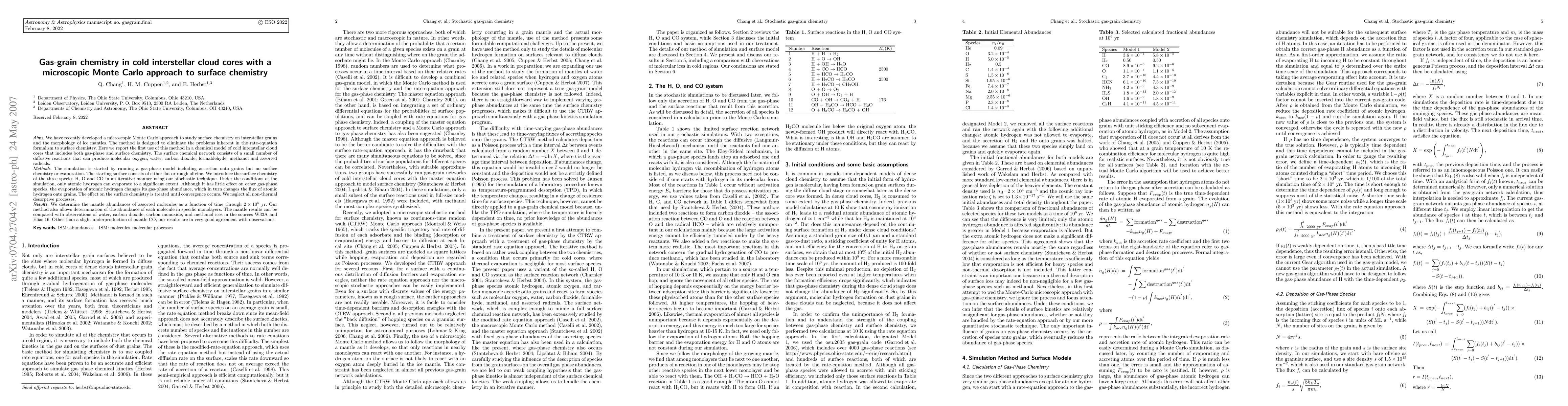 This paper introduces a microscopic Monte Carlo approach to study gas-grain chemistry in cold interstellar cloud cores, focusing on surface reactions on grains. The method, which avoids issues with rate-equation formalism, shows good agreement with observational data for ice mantles of water, carbon dioxide, and methanol, despite a minor underproduction of carbon monoxide.