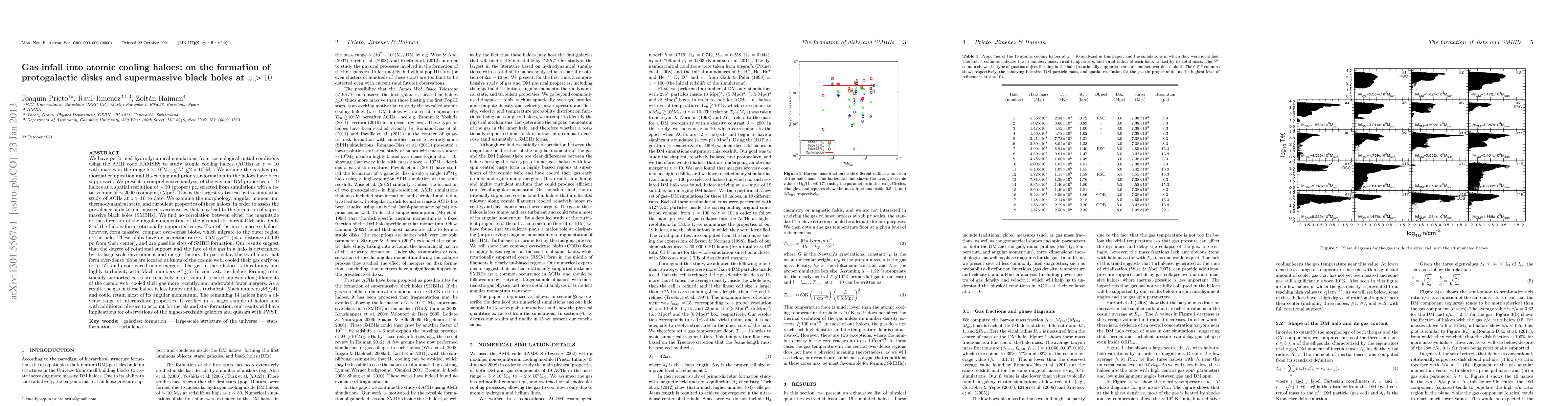 We have performed cosmo-hydro simulations using the RAMSES code to study atomic cooling (ACHs) haloes at z=10 with masses 5E7Msun<~M<~2E9Msun. We assume primordial gas and H2-cooling and prior star-formation have been suppressed. We analysed 19 haloes (gas and DM) at a resolution of ~10 (proper) pc, selected from a total volume of ~2E3 (comoving) Mpc3. This is the largest statistical hydro-sim. study of ACHs at z>10 to date. We examine the morphology, angular momentum (AM), thermodynamic, and turbulence of these haloes, in order to assess the prevalence of disks and supermassive black holes (SMBHs). We find no correlation between either the magnitude or the direction of the AM of the gas and its parent DM halo. Only 3 haloes form rotationally supported cores. Two of the most massive haloes form massive, compact overdense blobs. These blobs have an accretion rate ~0.5 Msun/yr (at a distance of 100 pc), and are possible sites of SMBH formation. Our results suggest that the degree of rotational support and the fate of the gas in a halo is determined by its large-scale environment and merger history. In particular, the two haloes forming blobs are located at knots of the cosmic web, cooled early on, and experienced many mergers. The gas in these haloes is lumpy and highly turbulent, with Mach N. >~ 5. In contrast, the haloes forming rotationally supported cores are relatively more isolated, located midway along filaments, cooled more recently, and underwent fewer mergers. Thus, the gas in these haloes is less lumpy and less turbulent (Mach <~ 4), and could retain most of its AM. The remaining 14 haloes have intermediate properties. If verified in a larger sample of haloes and with additional physics, our results will have implications for observations of the highest-redshift galaxies and quasars with JWST.