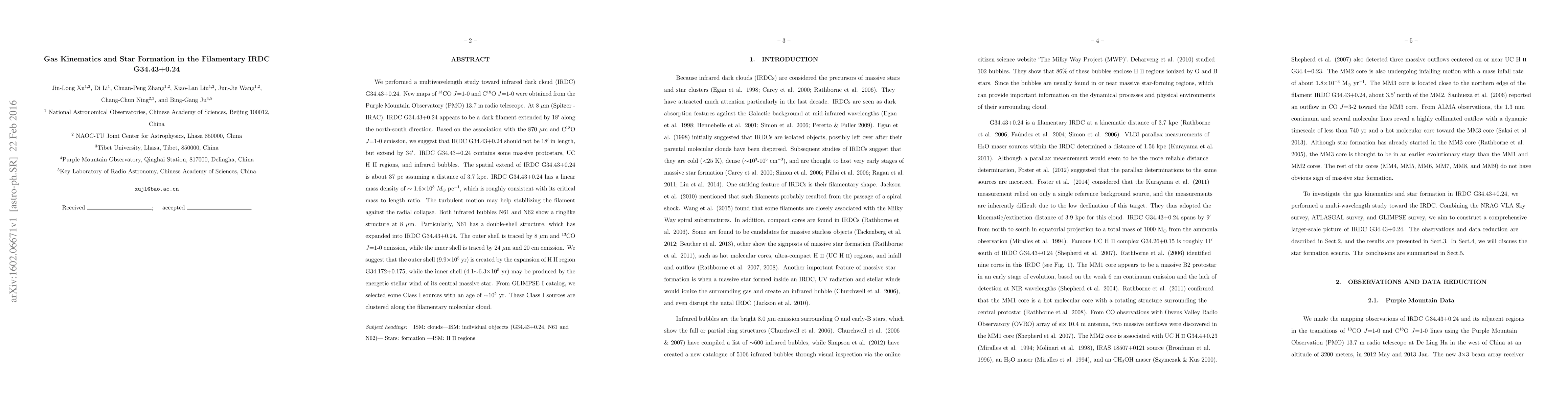This study utilized Spitzer-IRAC 8µm emission, ATLASGAL 870µm emission, NVSS 21cm emission, C18O J=1-0 channel maps, and 13CO J=1-0 channel maps to analyze the physical parameters of region II and III associated with IRDC G34.43+0.24.