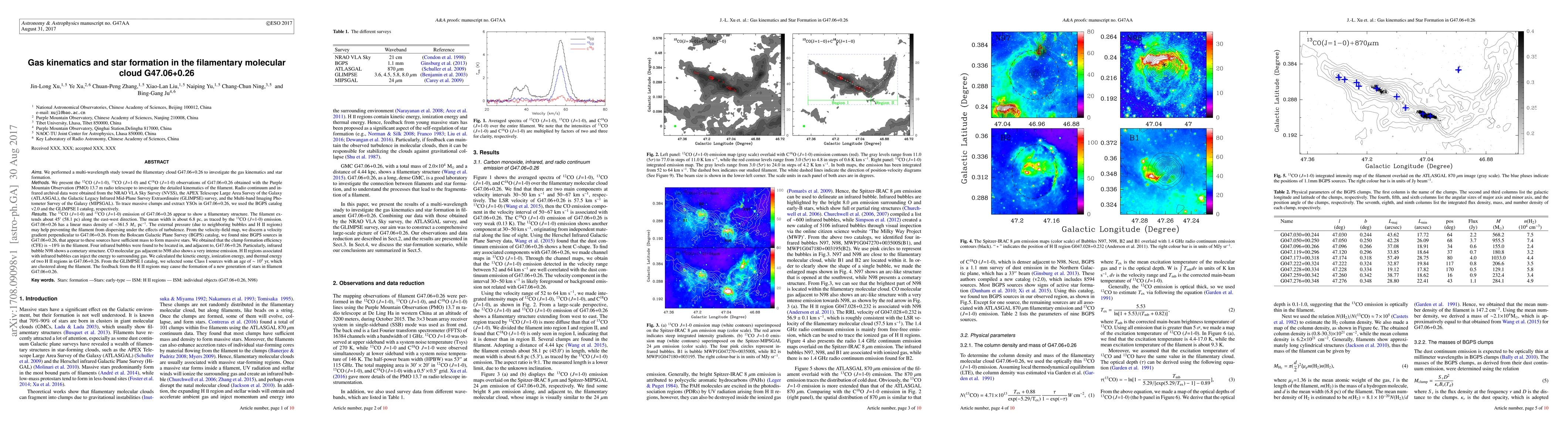 We performed a multi-wavelength study toward the filamentary cloud G47.06+0.26 to investigate the gas kinematics and star formation. We present the 12CO (J=1-0), 13CO (J=1-0) and C18O (J=1-0) observations of G47.06+0.26 obtained with the Purple Mountain Observation (PMO) 13.7 m radio telescope to investigate the detailed kinematics of the filament. The 12CO (J=1-0) and 13CO (J=1-0) emission of G47.06+0.26 appear to show a filamentary structure. The filament extends about 45 arcmin (58.1 pc) along the east-west direction. The mean width is about 6.8 pc, as traced by the 13CO (J=1-0) emission. G47.06+0.26 has a linear mass density of about 361.5 Msun/pc. The external pressure (due to neighboring bubbles and H II regions) may help preventing the filament from dispersing under the effects of turbulence. From the velocity-field map, we discern a velocity gradient perpendicular to G47.06+0.26. From the Bolocam Galactic Plane Survey (BGPS) catalog, we found nine BGPS sources in G47.06+0.26, that appear to these sources have sufficient mass to form massive stars. We obtained that the clump formation efficiency (CFE) is about 18% in the filament. Four infrared bubbles were found to be located in, and adjacent to, G47.06+0.26. Particularly, infrared bubble N98 shows a cometary structure. CO molecular gas adjacent to N98 also shows a very intense emission. H II regions associated with infrared bubbles can inject the energy to surrounding gas. We calculated the kinetic energy, ionization energy, and thermal energy of two H II regions in G47.06+0.26. From the GLIMPSE I catalog, we selected some Class I sources with an age of about 100000 yr, which are clustered along the filament. The feedback from the H II regions may cause the formation of a new generation of stars in filament G47.06+0.26.