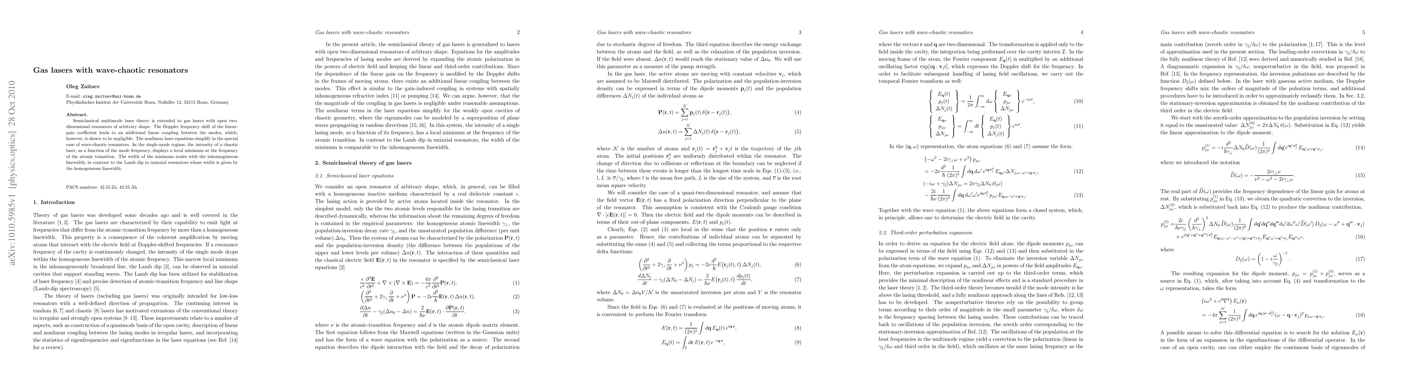 This paper extends semiclassical multimode laser theory to gas lasers with wave-chaotic resonators, showing that Doppler frequency shifts cause negligible linear coupling between modes. It finds that chaotic resonators simplify nonlinear laser equations and reveal a local intensity minimum in single-mode chaotic lasers, whose width correlates with inhomogeneous linewidth.