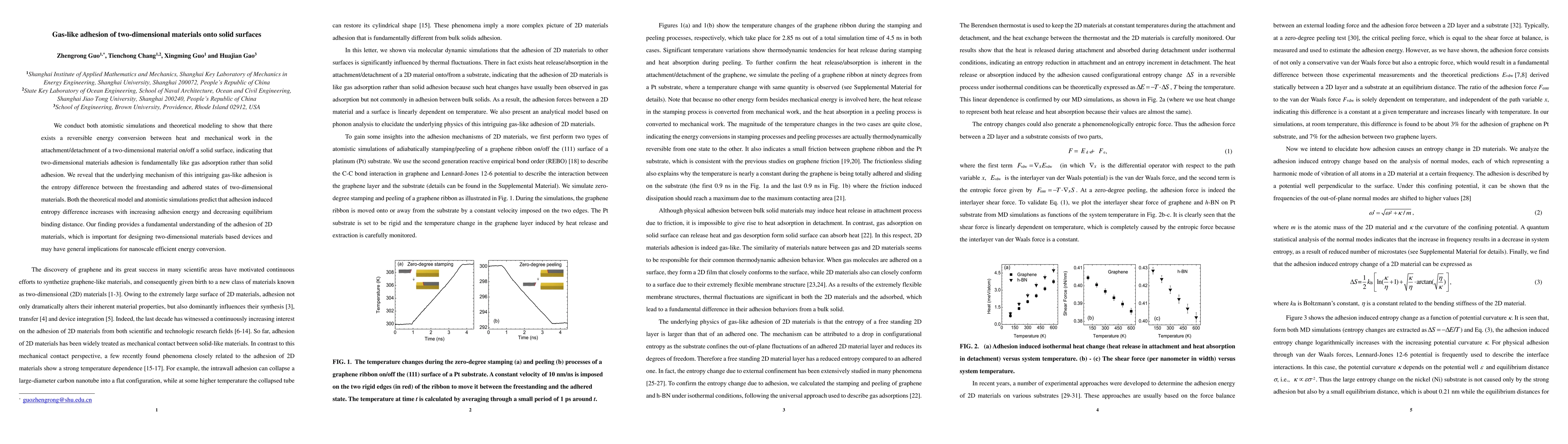 The adhesion of two-dimensional (2D) materials to other surfaces is so far believed to be a solid-solid mechanical contact. Here, we conduct both atomistic simulations and theoretical modeling to show that there exists a reversible conversion of energy between thermal and mechanical work in the attachment/detachment of 2D materials on/off a surface, indicating that 2D materials adhesion is fundamentally like gas adsorption rather than solid adhesion. We reveal that the underlying mechanism of this intriguing gas-like adhesion for 2D materials is the entropy difference between their freestanding and adhered states. Both the theoretical model and atomistic simulations predict that adhesion induced entropy difference increases with increasing adhesion energy and decreasing equilibrium binding distance. The present findings provide a fundamental guidance toward understanding the adhesion of 2D materials, which is important for designing 2D materials based devices and may have general implications for nanoscale efficient energy conversion.