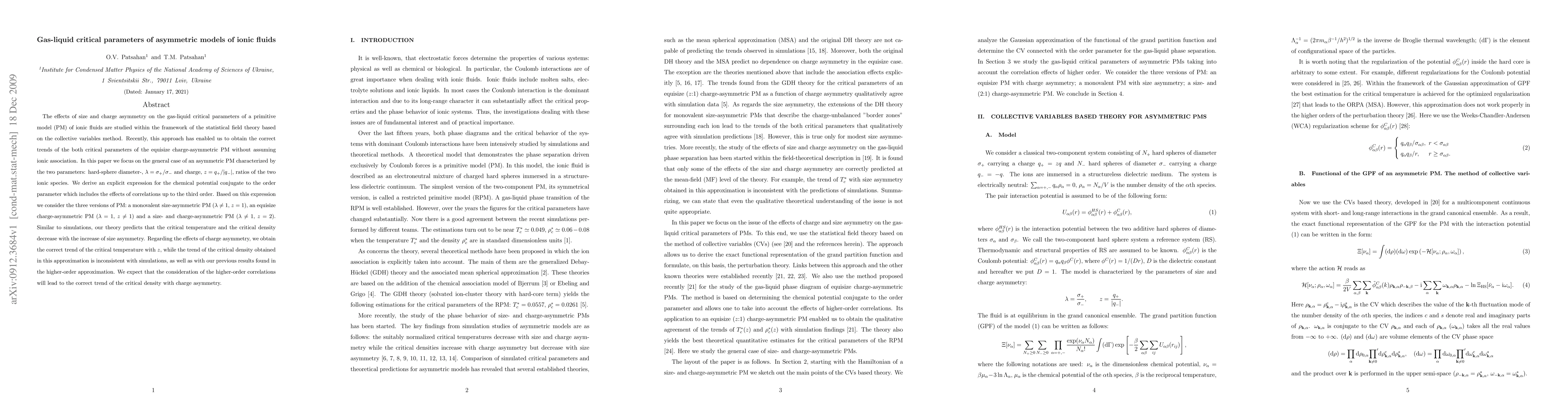This paper investigates the impact of size and charge asymmetry on the gas-liquid critical parameters of ionic fluids using statistical field theory. It finds that critical temperature and density decrease with increasing size asymmetry, while the critical temperature trend with charge asymmetry is correct, but the density trend is inconsistent with simulations and previous results.