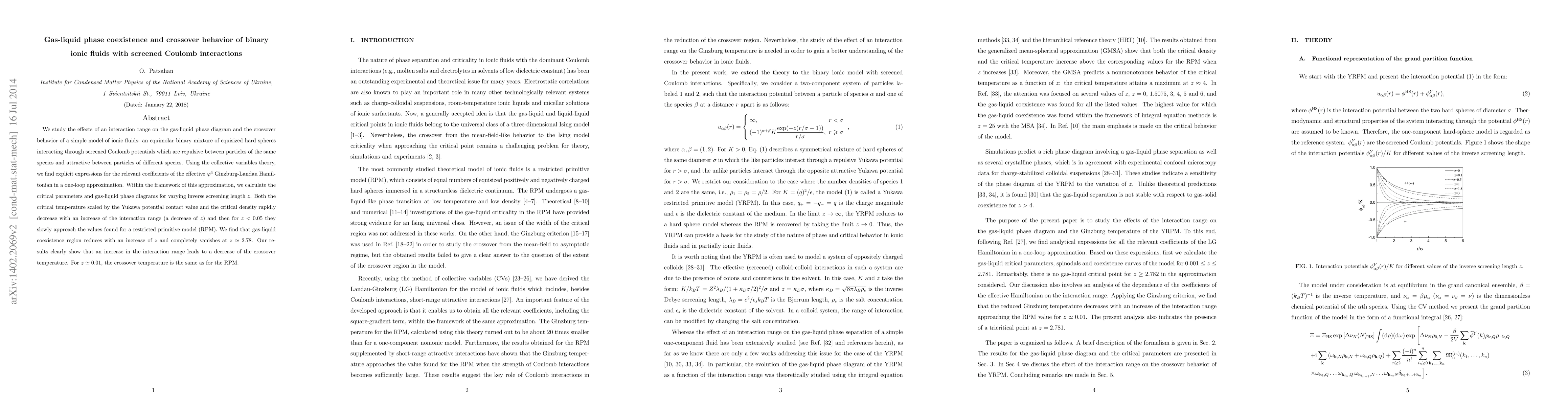 We study the gas-liquid phase diagram and the crossover behavior of a simple model of ionic fluid: an equimolar binary mixture of equisized hard spheres interacting through screened Coulomb potentials which are repulsive between particles of the same species and attractive between particles of different species. Using our previous results, we obtain explicit expressions for the relevant coefficients of the effective $\varphi^{4}$ Ginzburg-Landau Hamiltonian in a one-loop approximation. Within the framework of this approximation, we calculate the critical parameters and gas-liquid coexistence curves for different values of the dimensionless inverse screening length $z$. The critical temperature scaled by the Yukawa potential contact value as well as the critical packing fraction rapidly decrease with an increase of the interaction range and then for $z<0.05$ slowly approach the values found for a purely ionic model, i.e., a restricted primitive model (RPM). The both trends are qualitatively consistent with the results of Monte Carlo simulations. We find that gas-liquid coexistence region reduces with an increase of $z$ and completely vanishes at $z\simeq 2.781$. This qualitatively agrees with the results of Monte Carlo simulations indicating a stable gas-liquid coexistence for $z\leq 4$. It is also shown that an increase in the interaction range from the one typical of simple fluids to the one typical of ionic fluids leads to a decrease of the crossover temperature. For $z\simeq 0.01$, the crossover temperature is the same as for the RPM. For $z\simeq 2.781$, our results indicate a tricritical point.