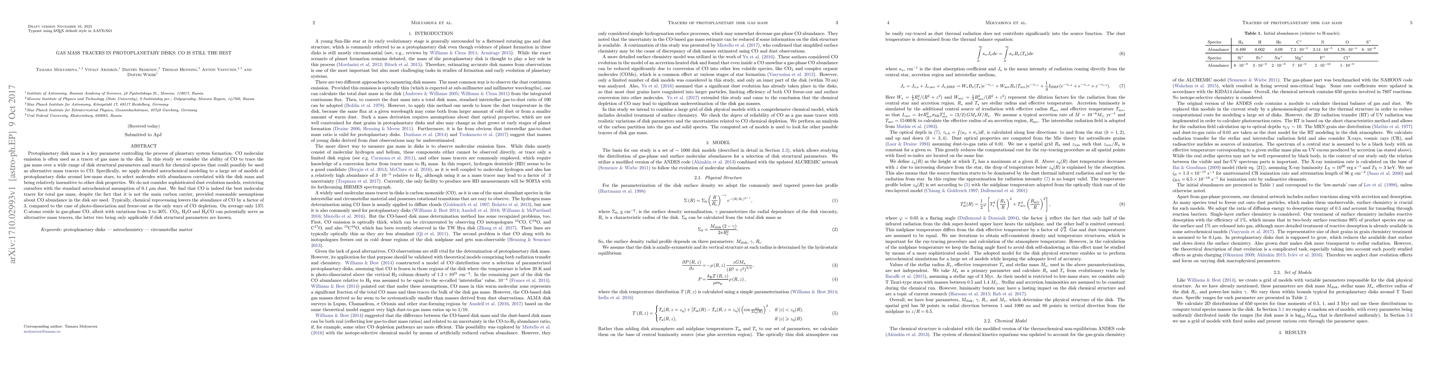 Protoplanetary disk mass is a key parameter controlling the process of planetary system formation. CO molecular emission is often used as a tracer of gas mass in the disk. In this study we consider the ability of CO to trace the gas mass over a wide range of disk structural parameters and search for chemical species that could possibly be used as alternative mass tracers to CO. Specifically, we apply detailed astrochemical modeling to a large set of models of protoplanetary disks around low-mass stars, to select molecules with abundances correlated with the disk mass and being relatively insensitive to other disk properties. We do not consider sophisticated dust evolution models, restricting ourselves with the standard astrochemical assumption of $0.1~\mu $m dust. We find that CO is indeed the best molecular tracer for total gas mass, despite the fact that it is not the main carbon carrier, provided reasonable assumptions about CO abundance in the disk are used. Typically, chemical reprocessing lowers the abundance of CO by a factor of 3, compared to the case of photo-dissociation and freeze-out as the only ways of CO depletion. On average only 13% C-atoms reside in gas-phase CO, albeit with variations from 2 to 30%. CO$_2$, H$_2$O and H$_2$CO can potentially serve as alternative mass tracers, the latter two being only applicable if disk structural parameters are known.