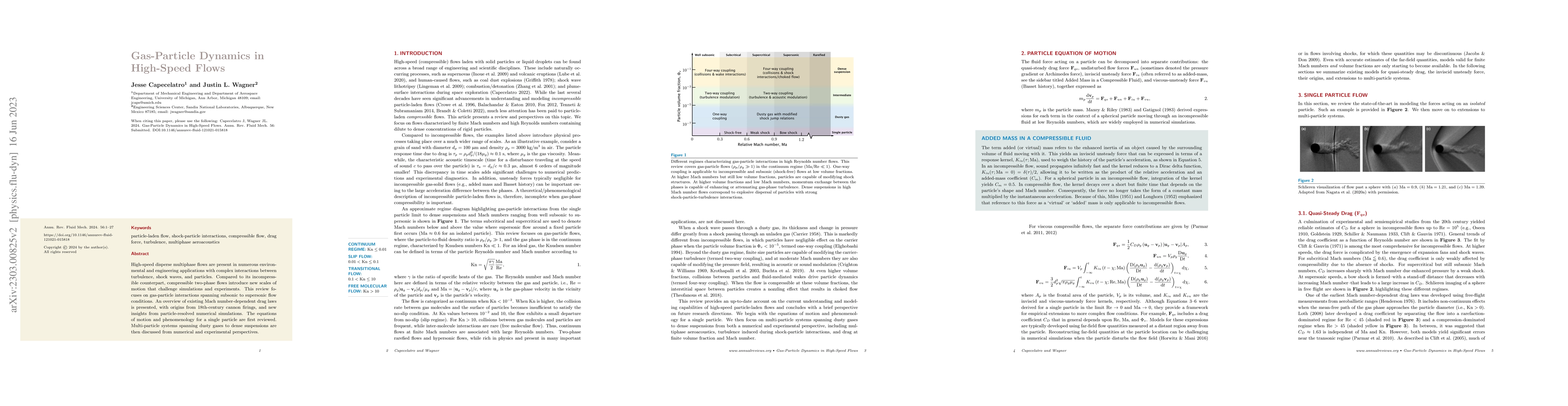 This paper reviews gas-particle dynamics in high-speed flows, focusing on interactions from subsonic to supersonic regimes. It discusses existing drag laws and recent insights from simulations, alongside the equations governing single and multi-particle systems, highlighting challenges in both numerical and experimental studies.