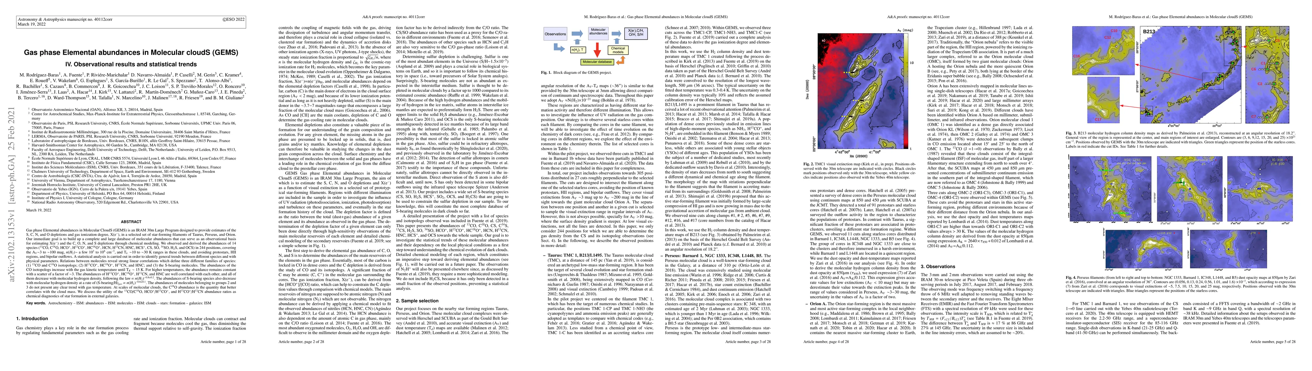 Gas phase Elemental abundances in Molecular CloudS (GEMS) is an IRAM 30m Large Program designed to estimate the S, C, N, and O depletions and gas ionization degree, X(e-), in a set of star-forming filaments of Taurus, Perseus and Orion. Our immediate goal is to build up a complete database of molecular abundances that can serve as an observational basis for estimating X(e-) and the C, O, N, and S depletions through chemical modeling. We observed and derived the abundances of 14 species (13CO, C18O, HCO+, H13CO+, HC18O+, HCN, H13CN, HNC, HCS+, CS, SO, 34SO, H2S, and OCS) in 244 positions, covering the AV 3 to 100 mag, n(H2) a few 10$^{3}$ to 10$^6$ cm$^{-3}$, and Tk 10 to 30 K ranges in these clouds, avoiding protostars, HII regions, and outflows. A statistical analysis is carried out to identify general trends between different species and with physical parameters. Relations between molecules reveal strong linear correlations which define three different families: (1) 13CO and C18O; (2) H13CO+, HC18O+, H13CN, and HNC; and (3) the S-bearing molecules. The abundances of the CO isotopologs increase with the gas kinetic temperature until TK 15 K. For higher temperatures, the abundance remains constant with a scatter of a factor of 3. The abundances of H13CO+, HC18O+, H13CN, and HNC are well correlated with each other, and all of them decrease with molecular hydrogen density, following the law n(H2)$^{-0.8\pm0.2}$. The abundances of S-bearing species also decrease with n(H2) at a rate of (S-bearing/H)gas n(H2)$^{-0.6\pm0.1}$. The abundances of molecules belonging to groups 2 and 3 do not present any clear trend with gas temperature. At scales of molecular clouds, the C18O abundance is the quantity that better correlates with the cloud mass. We discuss the utility of the 13CO/C18O, HCO+/H13CO+, and H13CO+/H13CN abundance ratios as chemical diagnostics of star formation in external galaxies.