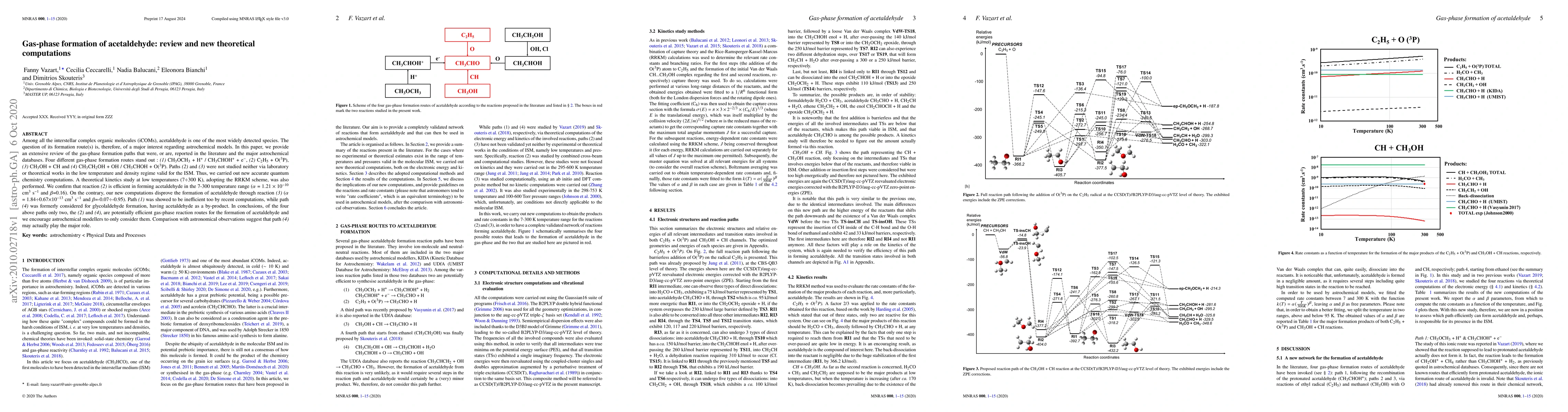 This paper reviews gas-phase formation routes for acetaldehyde in interstellar space, identifying four main pathways. New theoretical computations and kinetics studies confirm that pathways (2) and (4) are efficient, while (3) and (1) are not, suggesting that only (2) and (4) should be considered in astrochemical models.