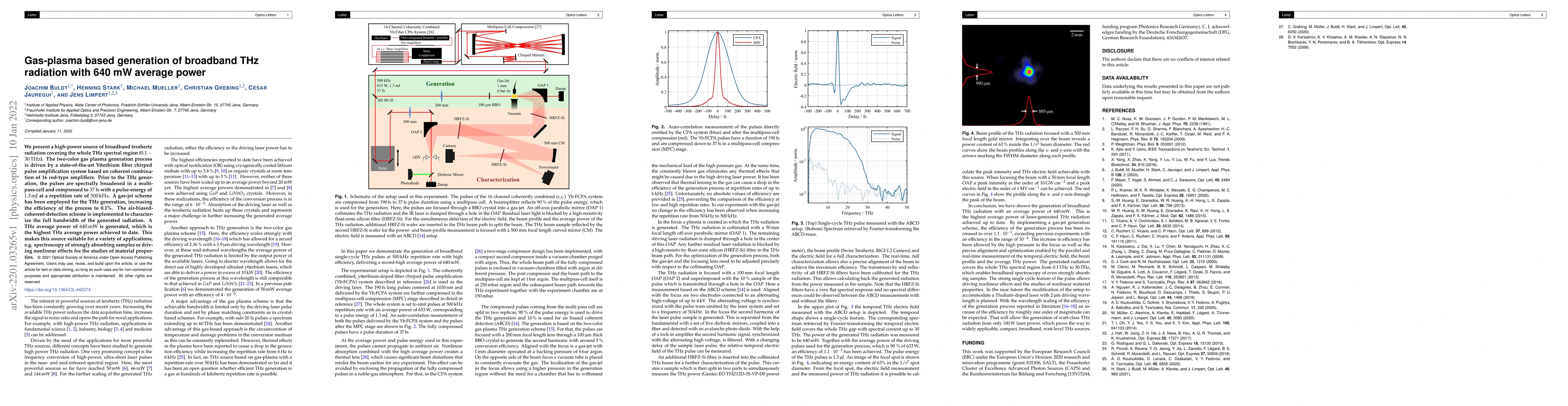 This paper introduces a high-power source of broadband terahertz radiation (0.1-30 THz) with an average power of 640 mW, achieved using a gas-plasma generation process driven by a Ytterbium fiber chirped pulse amplification system. The method is suitable for applications like spectroscopy and material property studies.