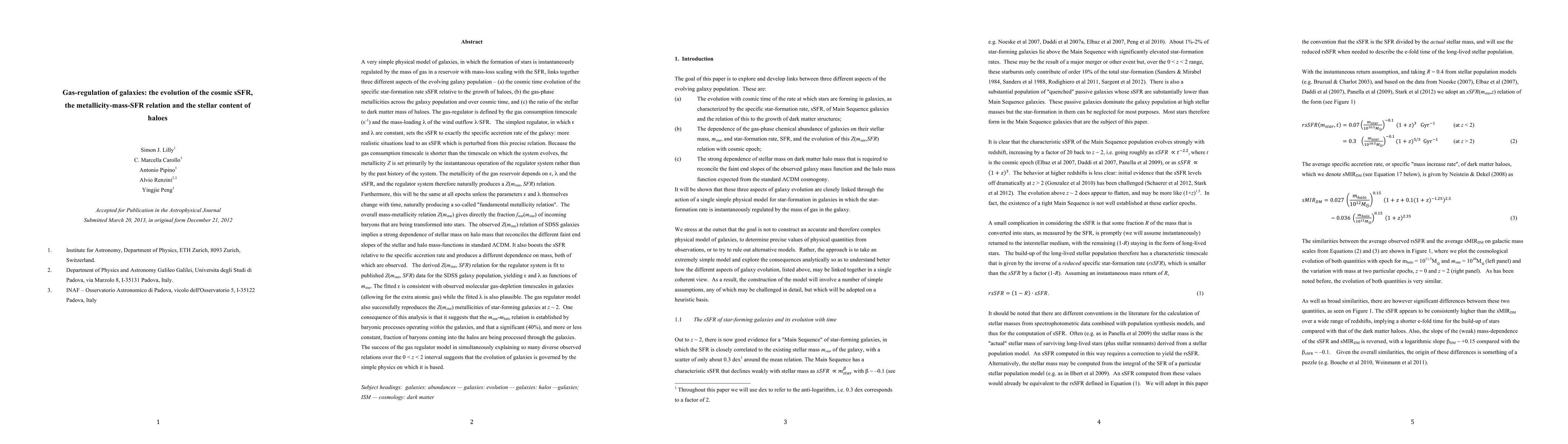 A very simple physical model of galaxies, in which the formation of stars is instantaneously regulated by the mass of gas in a reservoir, links together three different aspects of the evolving galaxy population:(a) the cosmic time evolution of the specific star-formation rate sSFR relative to the growth of haloes, (b) the gas-phase metallicities across the galaxy population and over cosmic time, and (c) the ratio of the stellar to dark matter mass of haloes. If the SFR efficiency and wind mass loading are constant, the sSFR is set to the specific accretion rate of the galaxy: more realistic situations lead to an sSFR which is perturbed from this identity. The metallicity is set by the instantaneous operation of the regulator system rather than by the past history of the system. The regulator system naturally produces a Z(mstar, SFR) relation, with SFR as a second parameter in the mass-metallicity relation. This will be the same at all epochs unless the efficiency and mass-loading change with time, naturally producing a so-called "fundamental metallicity relation". The observed Z(mstar) relation of SDSS galaxies implies a strong dependence of stellar mass on halo mass that reconciles the different faint end slopes of the stellar and halo mass-functions in standard {\Lambda}CDM. It also boosts the sSFR relative to the specific accretion rate and produces a different dependence on mass, both of which are observed. The derived Z(mstar, SFR) relation for the regulator system is fit to published Z(mstar, SFR) data. The fitted efficiency is consistent with observed molecular gas-depletion timescales in galaxies while the fitted mass-loading is also plausible. The model also successfully reproduces the mass-metallicity relation of star-forming galaxies at z ~ 2.