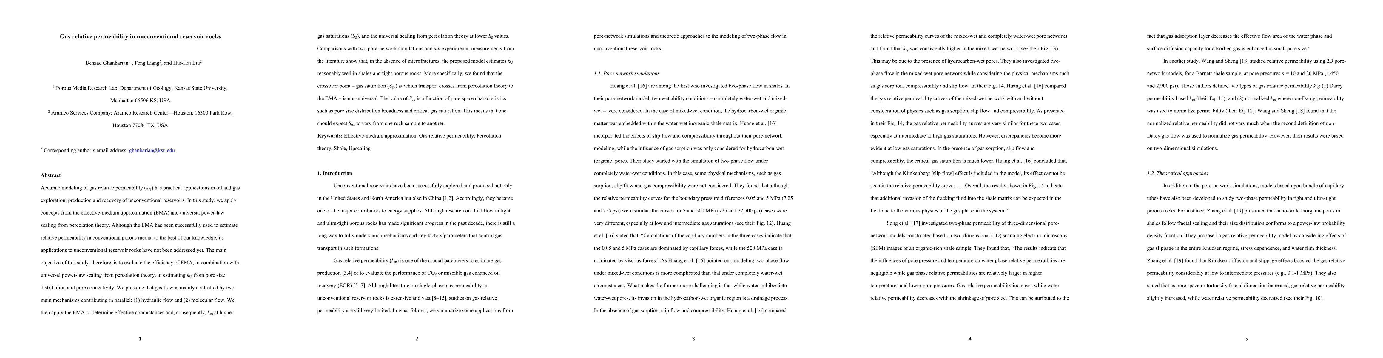 This study evaluates the effectiveness of the effective-medium approximation (EMA) combined with universal power-law scaling from percolation theory for estimating gas relative permeability in unconventional reservoir rocks. The model estimates gas relative permeability reasonably well, with the crossover gas saturation varying based on pore space characteristics.