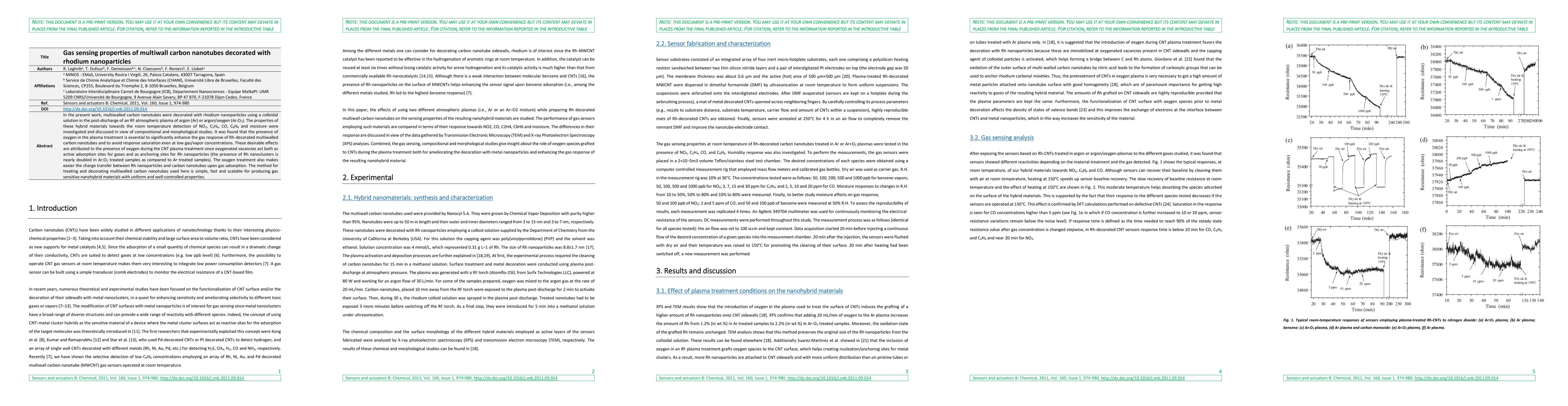 This study investigates the gas sensing properties of multiwall carbon nanotubes decorated with rhodium nanoparticles, finding that oxygen in plasma treatment enhances gas response by creating oxygenated vacancies that act as adsorption sites and anchoring sites for Rh nanoparticles, facilitating charge transfer and improving sensitivity at low gas concentrations. The method is simple, scalable, and produces uniform nanohybrid materials.