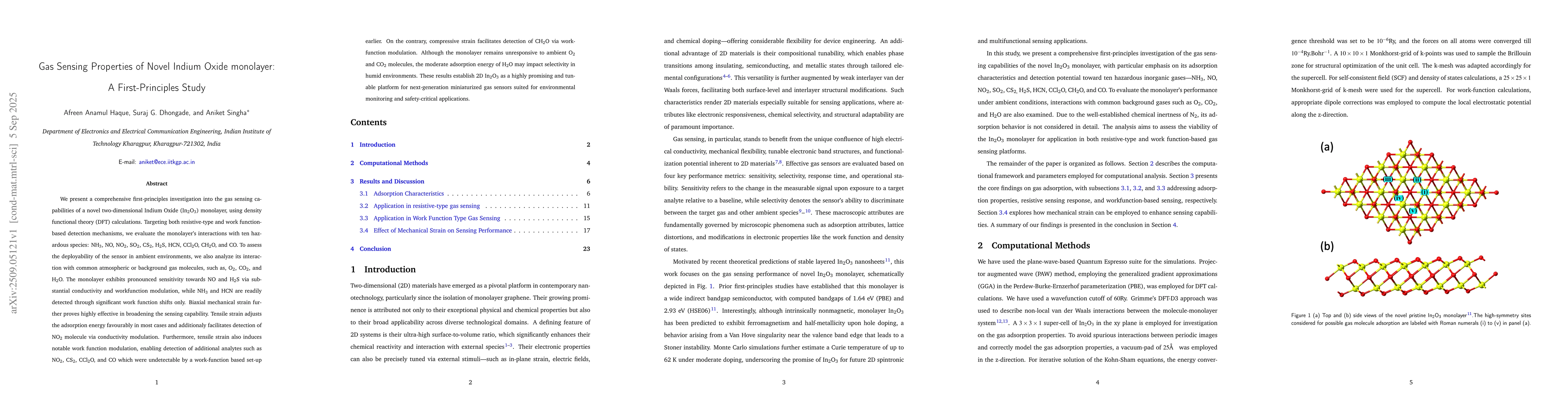 We present a comprehensive first-principles investigation into the gas sensing capabilities of a novel two-dimensional Indium Oxide (In2O3) monolayer, using density functional theory (DFT) calculations. Targeting both resistive-type and work function based detection mechanisms, we evaluate interactions with ten hazardous gases (NH3, NO, NO2, SO2, CS2, H2S, HCN, CCl2O, CH2O, CO) as well as ambient molecules (O2, CO2, H2O). The monolayer shows pronounced sensitivity towards NO and H2S, and work function modulation enables detection of NH3 and HCN. Mechanical strain further broadens detection capability, enhancing adsorption and selectivity. These results establish 2D In2O3 as a tunable platform for next-generation miniaturized gas sensors for environmental monitoring and safety applications.