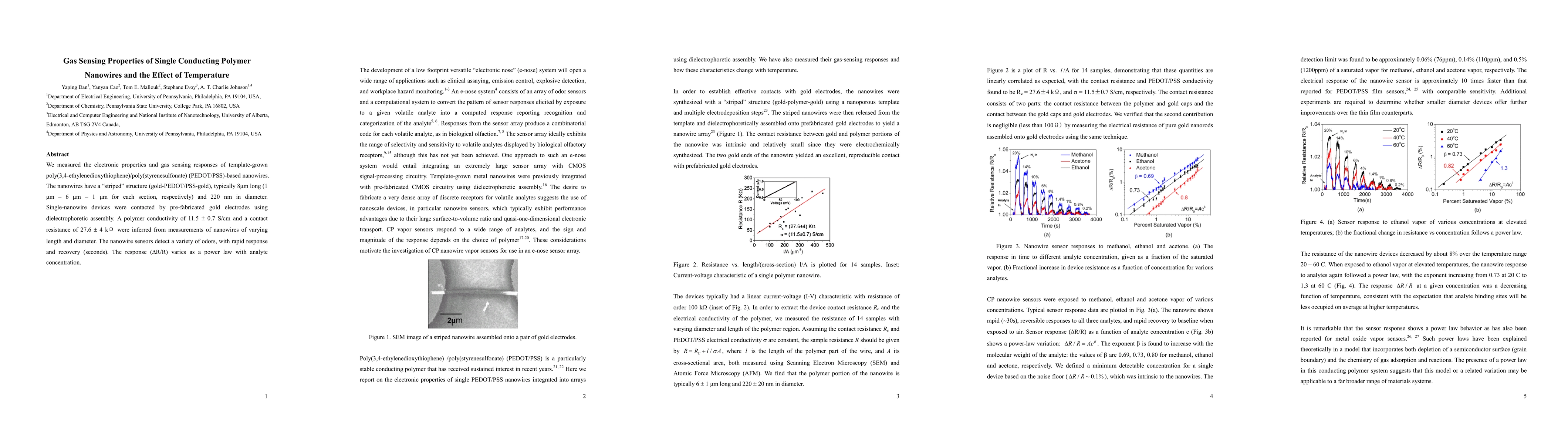 This study investigates the gas sensing properties of single PEDOT/PSS nanowires, revealing rapid response and recovery times for various odors. The temperature dependence of the sensor's response is also examined, highlighting the nanowires' potential for use in gas detection applications.