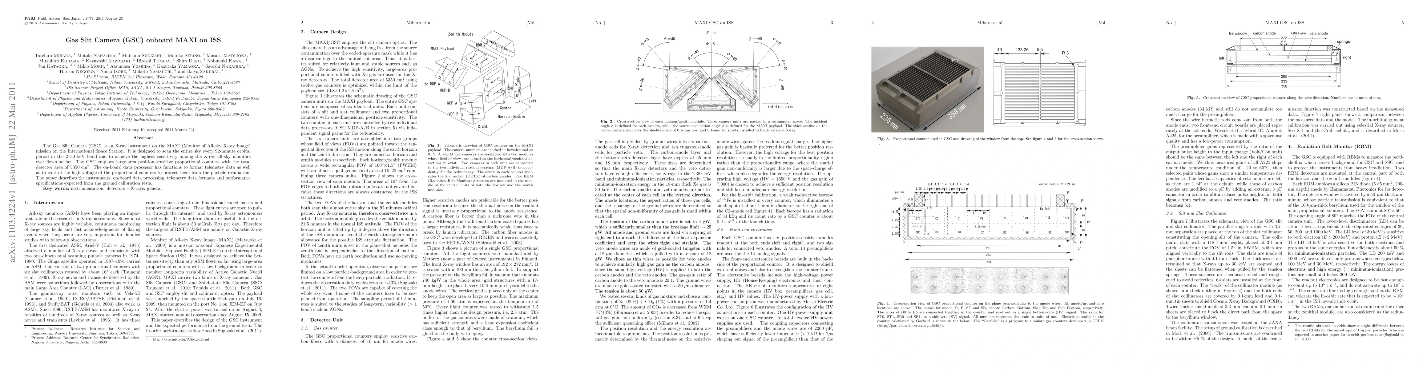 The Gas Slit Camera (GSC) on the MAXI mission aboard the ISS is an X-ray instrument designed for high-sensitivity sky scans in the 2-30 keV band, utilizing large-area proportional counters and on-board data processing to manage telemetry and protect against particle irradiation. The paper details its design, data processing, and expected performance from calibration tests.