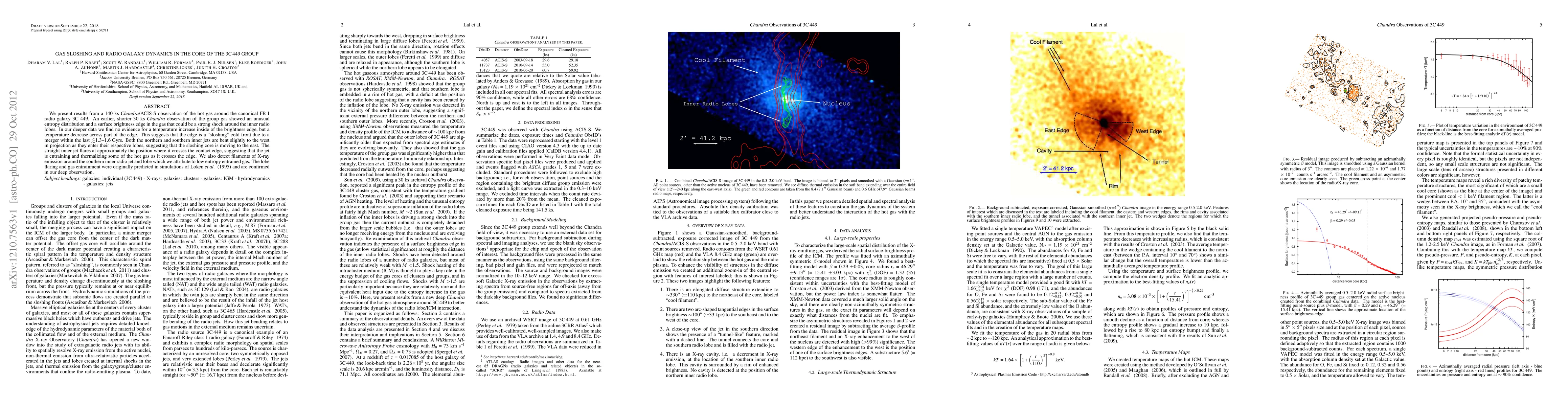 This study uses Chandra data to investigate gas sloshing in the core of radio galaxy 3C449, revealing a temperature decrease across a cold front that suggests a merger occurred within 1.3-1.6 Gyrs ago.