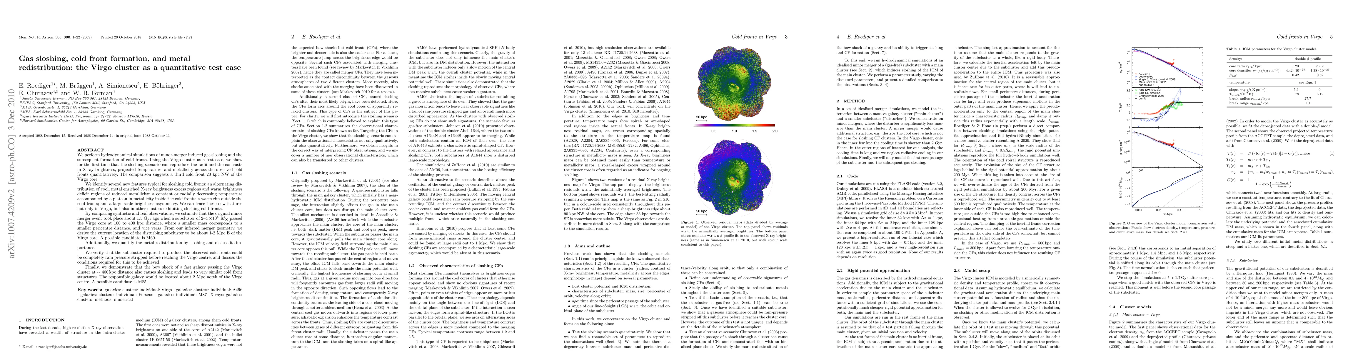 (abridged) We perform hydrodynamical simulations of minor-merger induced gas sloshing and the subsequent formation of cold fronts in the Virgo cluster. We show for the first time that sloshing reproduces all characteristics of the observed cold fronts quantitatively, and we suggest a third cold front at 20 kpc NW of the Virgo core. We identify several new features typical for sloshing cold fronts, most importantly a large-scale brightness asymmetry. We can trace these new features not only in Virgo, but also in other sloshing cold front clusters. By comparing synthetic and real observations, we estimate that the original minor merger event took place about 1.5 Gyr ago when a subcluster of 2-4 \times 10^13 M\odot passed the Virgo core at 100 to 400 kpc distance, where a smaller mass corresponds to a smaller pericentre distance, and vice versa. From the merger geometry, we derive the current location of the disturbing subcluster to be about 1-2 Mpc E of the Virgo core. A possible candidate is M60. Additionally, we quantify the metal redistribution by sloshing and discuss its importance. We verify that the subcluster required to produce the observed cold fronts could be completely ram pressure stripped before reaching the Virgo centre, and discuss the conditions required for this to be achieved. Finally, we demonstrate that the bow shock of a fast galaxy passing the Virgo cluster at ~ 400 kpc distance also causes sloshing and leads to very similar cold front structures. The responsible galaxy would be located about 2 Mpc north of the Virgo centre. A possible candidate is M85.