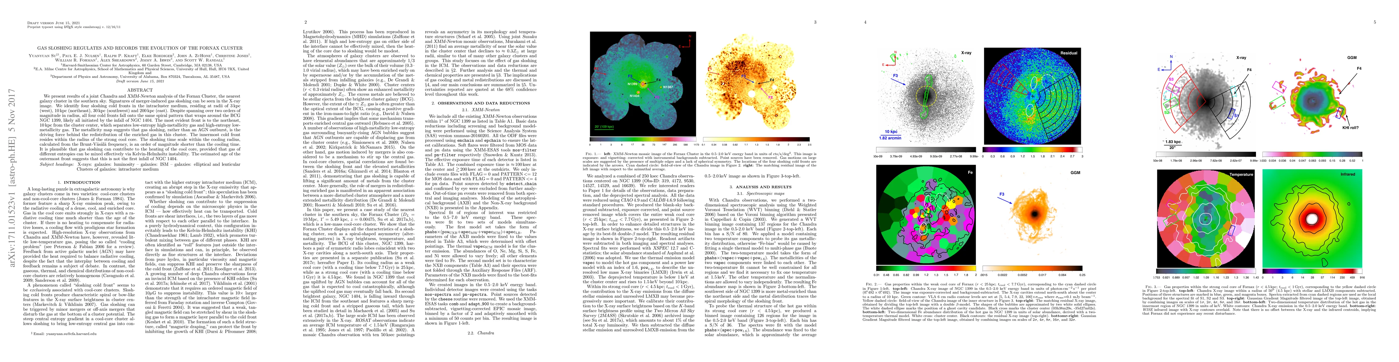 We present results of a joint {\sl Chandra} and {\sl XMM-Newton} analysis of the Fornax Cluster, the nearest galaxy cluster in the southern sky. Signatures of merger-induced gas sloshing can be seen in the X-ray image. We identify four sloshing cold fronts in the intracluster medium, residing at radii of 3\,kpc (west), 10\,kpc (northeast), 30\,kpc (southwest) and 200\,kpc (east). Despite spanning over two orders of magnitude in radius, all four cold fronts fall onto the same spiral pattern that wraps around the BCG NGC~1399, likely all initiated by the infall of NGC~1404. The most evident front is to the northeast, 10\,kpc from the cluster center, which separates low-entropy high-metallicity gas and high-entropy low-metallicity gas. The metallicity map suggests that gas sloshing, rather than an AGN outburst, is the driving force behind the redistribution of the enriched gas in this cluster. The innermost cold front resides within the radius of the strong cool core. The sloshing time scale within the cooling radius, calculated from the Brunt-V$\ddot{\rm a}$s$\ddot{\rm a}$l$\ddot{\rm a}$ frequency, is an order of magnitude shorter than the cooling time. It is plausible that gas sloshing can contribute to the heating of the cool core, provided that gas of different entropies can be mixed effectively via Kelvin-Helmholtz instability. The estimated age of the outermost front suggests that this is not the first infall of NGC~1404.