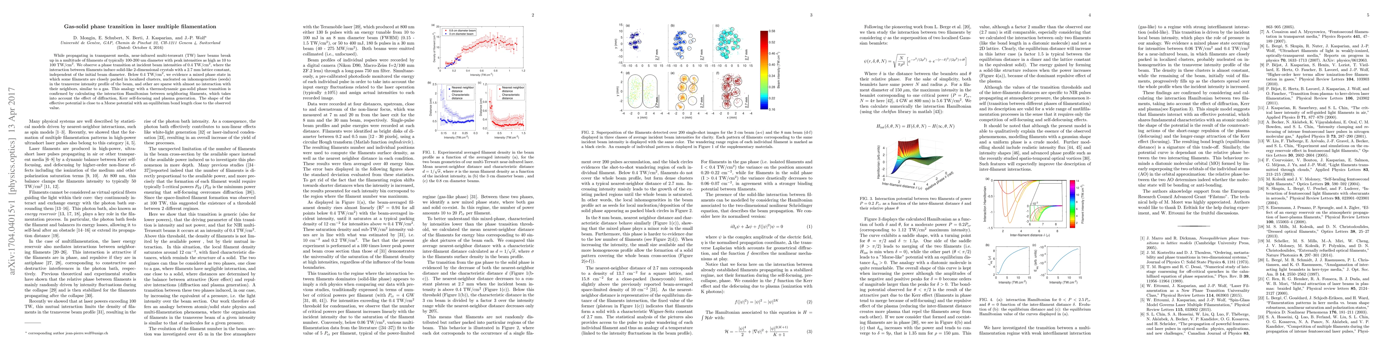 While propagating in transparent media, near-infrared multi-terawatt (TW) laser beams break up in a multitude of filaments of typically 100-200 um diameter with peak intensities as high as 10 to 100~TW/cm$^{2}$. We observe a phase transition at incident beam intensities of 0.4~TW/cm$^2$, where the interaction between filaments induce solid-like 2-dimensional crystals with a 2.7 mm lattice constant, independent of the initial beam diameter. Below 0.4~TW/cm$^2$, we evidence a mixed phase state in which some filaments are closely packed in localized clusters, nucleated on inhomogeneities (seeds) in the transverse intensity profile of the beam, and other are sparse with almost no interaction with their neighbors, similar to a gas. This analogy with a thermodynamic gas-solid phase transition is confirmed by calculating the interaction Hamiltonian between neighboring filaments, which takes into account the effect of diffraction, Kerr self-focusing and plasma generation. The shape of the effective potential is close to a Morse potential with an equilibrium bond length close to the observed value.