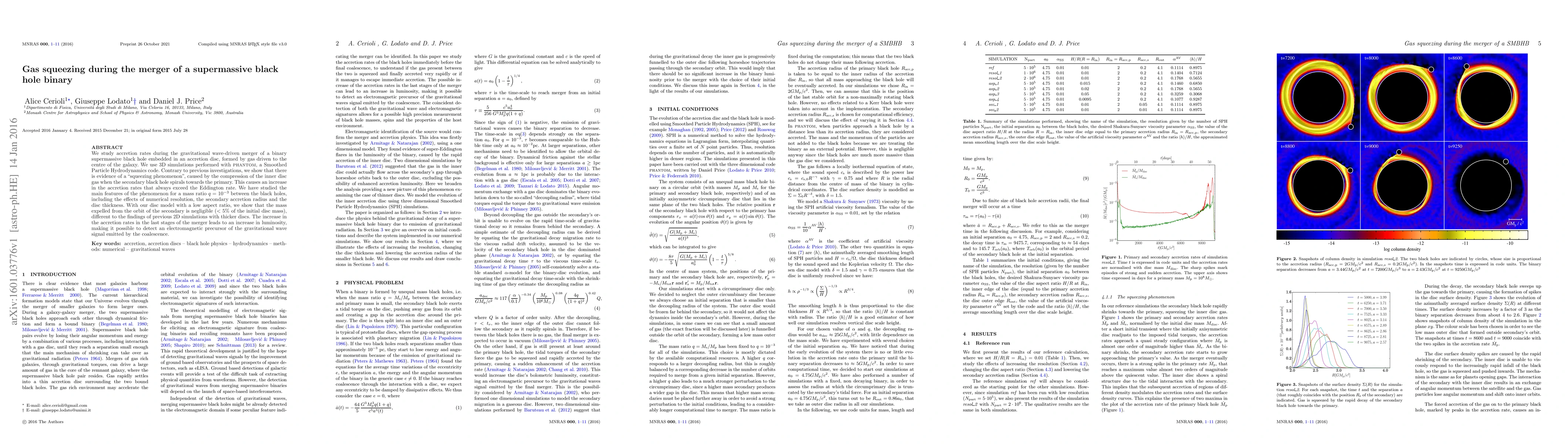 This research investigates the accretion rates during the merger of a supermassive black hole binary using 3D simulations, revealing a "squeezing phenomenon" that increases accretion rates beyond the Eddington limit due to inner disc gas compression. The study finds negligible mass expulsion and suggests an electromagnetic precursor detectable before gravitational wave emission.