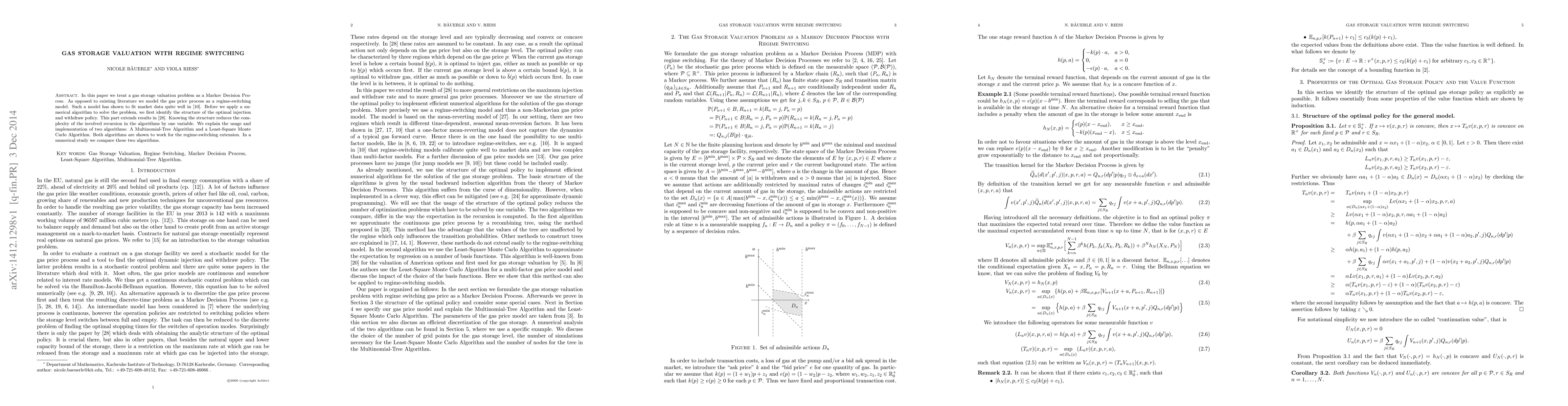 This paper models gas storage valuation as a regime-switching Markov Decision Process, extending Secomandi's results to identify the optimal policy structure. It implements two numerical algorithms—a Multinomial-Tree Algorithm and a Least-Square Monte Carlo Algorithm—to solve the valuation problem and compares their performance.