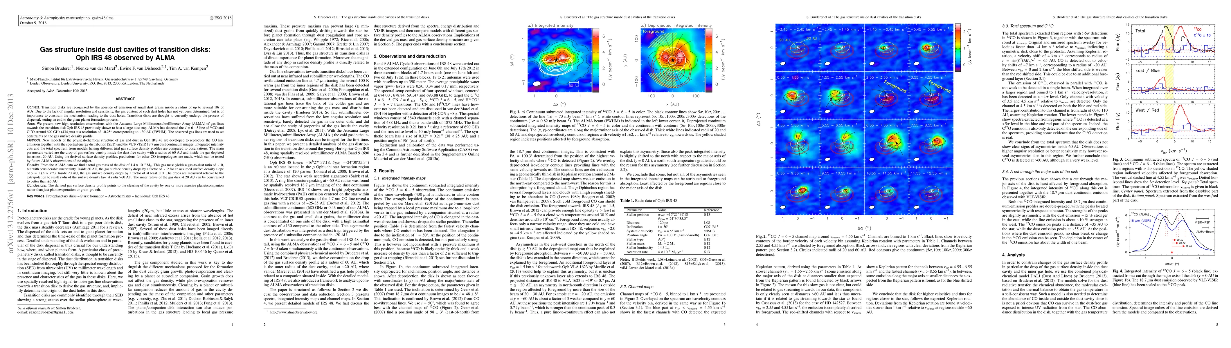 The ALMA observations of gas lines in the transition disk Oph IRS 48 reveal a gas surface density profile that suggests the cavity is cleared by the gravitational influence of a massive planet or companion, rather than solely by photoevaporation or grain-growth. These findings provide crucial insights into the mechanisms behind the formation of dust cavities in transition disks.