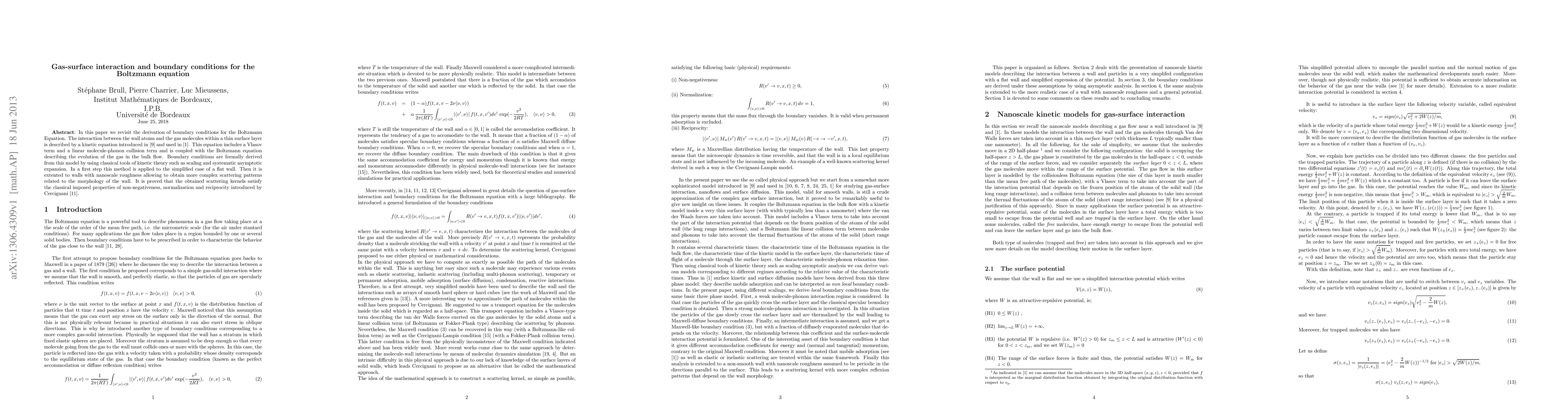 In this paper we revisit the derivation of boundary conditions for the Boltzmann Equation. The interaction between the wall atoms and the gas molecules within a thin surface layer is described by a kinetic equation introduced in [9] and used in [1]. This equation includes a Vlasov term and a linear molecule-phonon collision term and is coupled with the Boltzmann equation describing the evolution of the gas in the bulk flow. Boundary conditions are formally derived from this model by using classical tools of kinetic theory such as scaling and systematic asymptotic expansion. In a first step this method is applied to the simplified case of a flat wall. Then it is extented to walls with nanoscale roughness allowing to obtain more complex scattering patterns related to the morphology of the wall. It is proved that the obtained scattering kernels satisfy the classical imposed properties of non-negativeness, normalization and reciprocity introduced by Cercignani [11].
