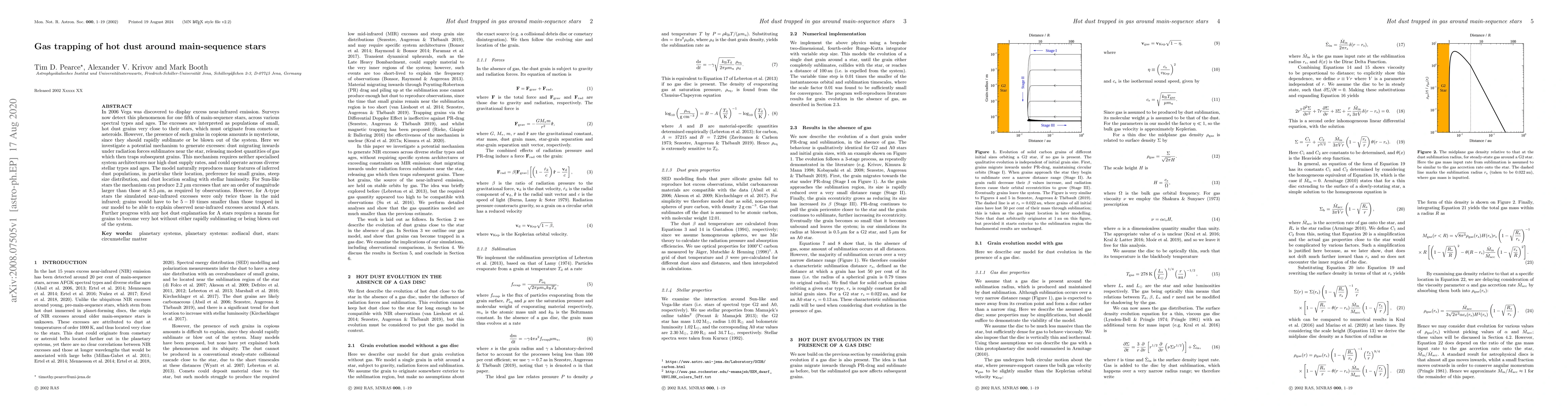 This paper explores a mechanism where gas trapping around main-sequence stars can explain the presence of hot dust, which emits excess near-infrared radiation. The proposed model suggests that inward migrating dust grains sublimate near the star, releasing gas that traps subsequent grains, thus sustaining the dust population.