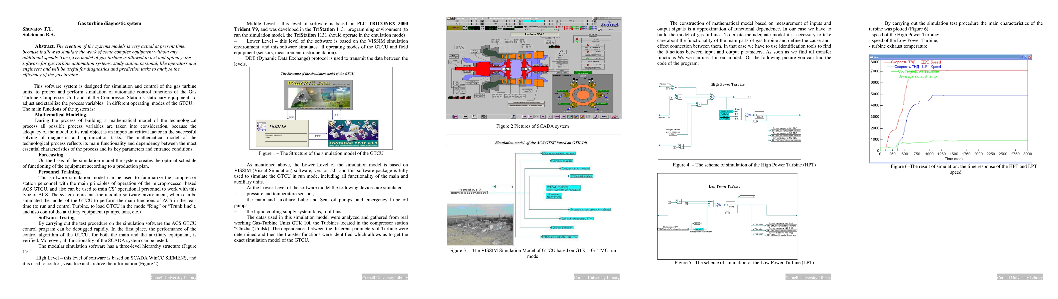 The creation of the systems models is very actual at present time, because it allow to simulate the work of some complex equipment without any additional spends. The given model of gas turbine is allowed to test and optimize the software for gas turbine automation systems, study station personal, like operators and engineers and will be useful for diagnostics and prediction tasks to analyze the efficiency of the gas turbine.