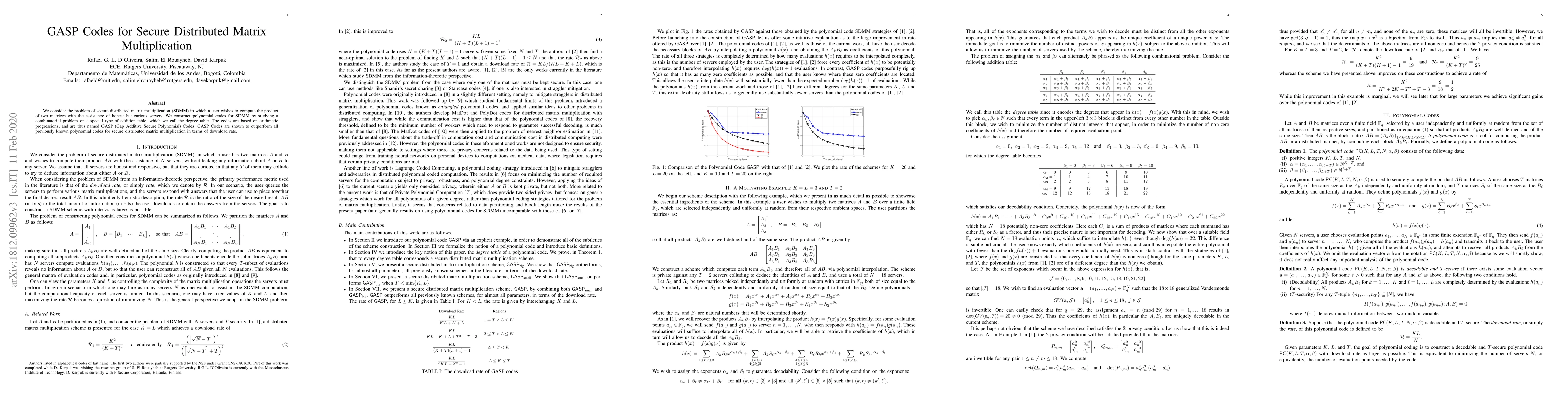 The paper introduces GASP Codes, a novel class of polynomial codes for secure distributed matrix multiplication, which are constructed by solving a combinatorial problem on a degree table and are proven to have superior download rates compared to previous methods.