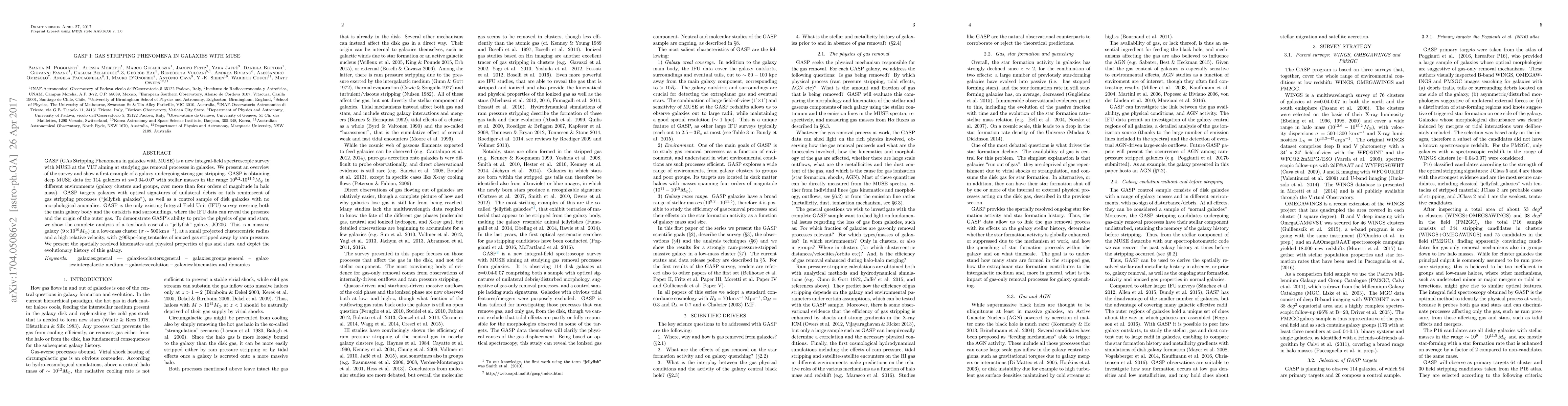 GASP I investigates gas stripping phenomena in galaxies using MUSE at the VLT, focusing on "jellyfish galaxies" and control samples. The study presents a detailed analysis of JO206, showcasing the survey's ability to reveal the kinematics and physical properties of stripped gas and stars.