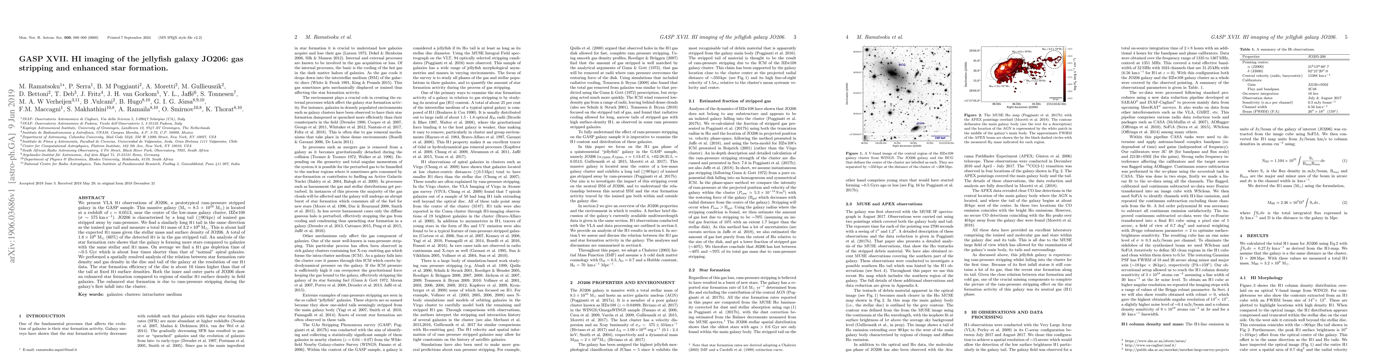 We present VLA HI observations of JO206, a prototypical ram-pressure stripped galaxy in the GASP sample. This massive galaxy (M$_{\ast} =$ 8.5 $\times$ 10$^{10}$ M$_{\odot}$) is located at a redshift of $z =$ 0.0513, near the centre of the low-mass galaxy cluster, IIZw108 ($\sigma \sim575$ km/s). JO206 is characterised by a long tail ($\geq$90 kpc) of ionised gas stripped away by ram-pressure. We find a similarly long HI tail in the same direction as the ionised gas tail and measure a total HI mass of $3.2 \times 10^{9}$ M$_{\odot}$. This is about half the expected HI mass given the stellar mass and surface density of JO206. A total of $1.8 \times 10^{9}$ M$_{\odot}$ (60%) of the detected HI is in the gas stripped tail. An analysis of the star formation rate shows that the galaxy is forming more stars compared to galaxies with the same stellar and HI mass. On average we find a HI gas depletion time of $\sim$0.5 Gyr which is about four times shorter than that of "normal" spiral galaxies. We performed a spatially resolved analysis of the relation between star formation rate density and gas density in the disc and tail of the galaxy at the resolution of our HI data. The star formation efficiency of the disc is about 10 times higher than that of the tail at fixed HI surface densities. Both the inner and outer parts of JO206 show an enhanced star formation compared to regions of similar HI surface density in field galaxies. The enhanced star formation is due to ram-pressure stripping during the galaxy's first infall into the cluster.