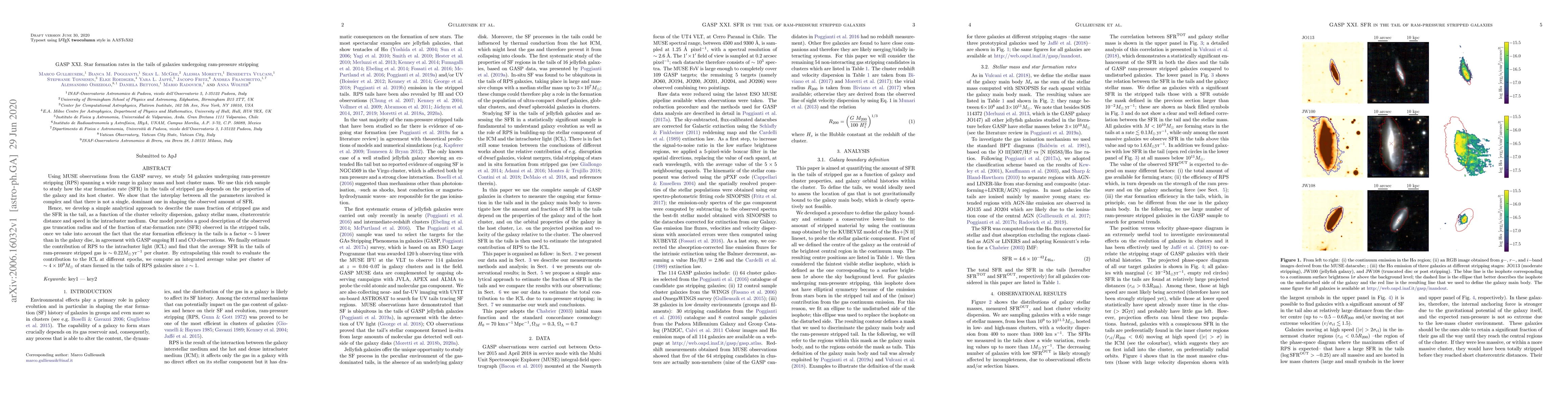 The GASP XXI study investigates the star formation rates in the tails of galaxies undergoing ram-pressure stripping, revealing a complex interplay of galaxy and cluster properties. The research develops a model to describe the mass fraction of stripped gas and star formation in the tails, finding that the star formation efficiency in the tails is about five times lower than in the galaxy disc.