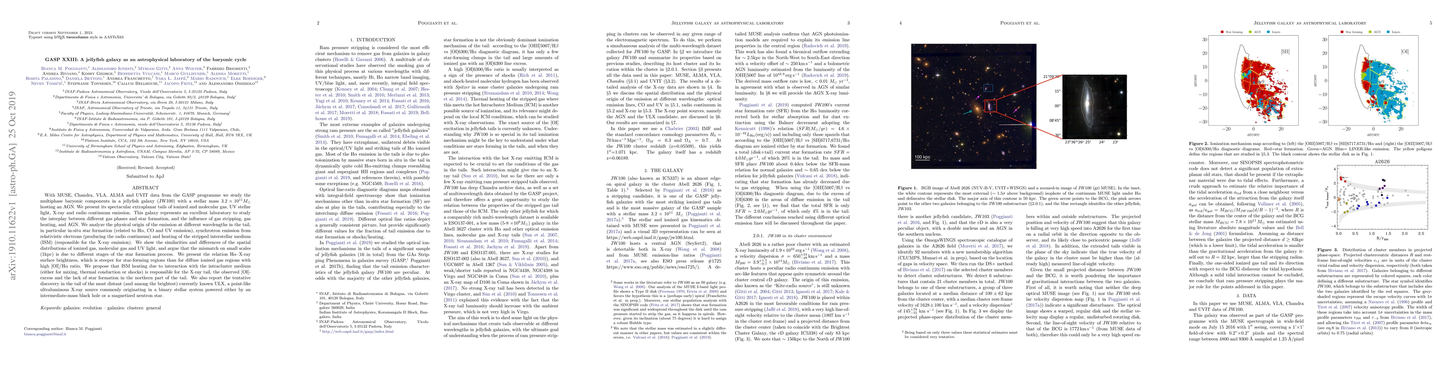 This paper uses multi-wavelength data to study the jellyfish galaxy JW100, revealing its extraplanar tails of ionized and molecular gas, and the interplay between different gas phases and star formation. The galaxy's unique features, including a ULX, provide insights into gas stripping, AGN influence, and ISM heating by the intracluster medium.