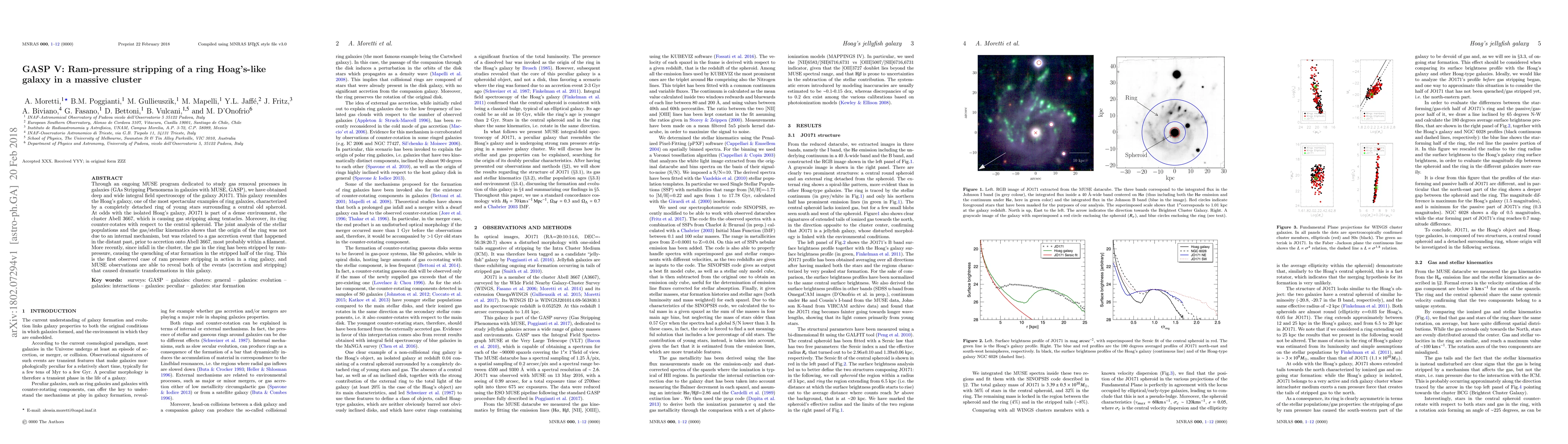 This paper reports on the ram-pressure stripping of JO171, a Hoag's-like ring galaxy in the Abell 3667 cluster, using MUSE observations. The galaxy's ring formed from a past gas accretion event, but recent cluster infall has stripped gas from the ring, quenching star formation.