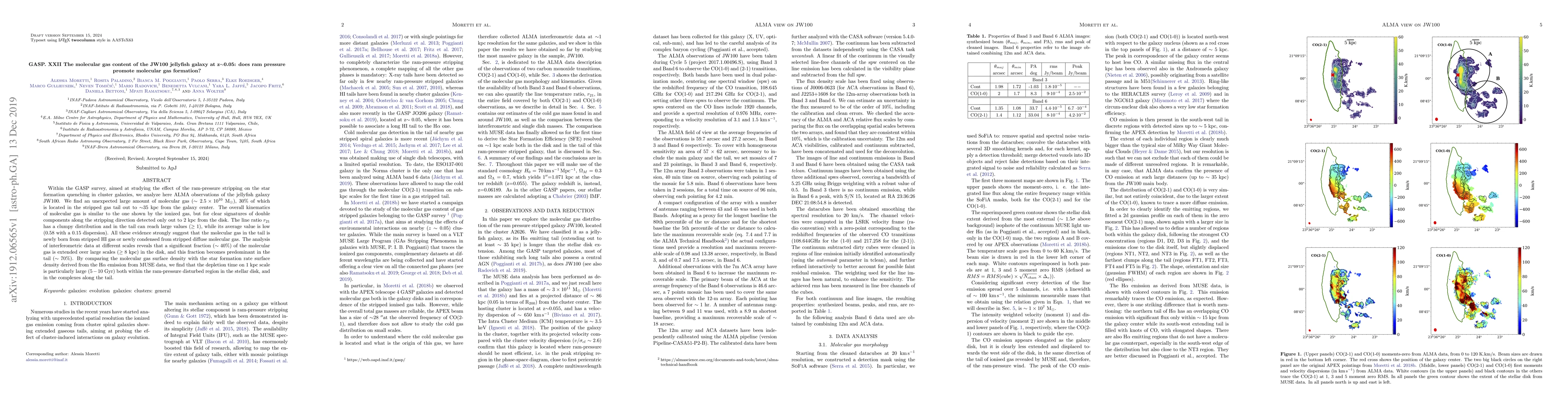 The GASP survey reveals that the jellyfish galaxy JW100 contains an unexpectedly large amount of molecular gas, suggesting that ram pressure may promote its formation. The molecular gas, including a significant fraction in the stripped tail, indicates new gas formation from stripped HI or condensed molecular gas.