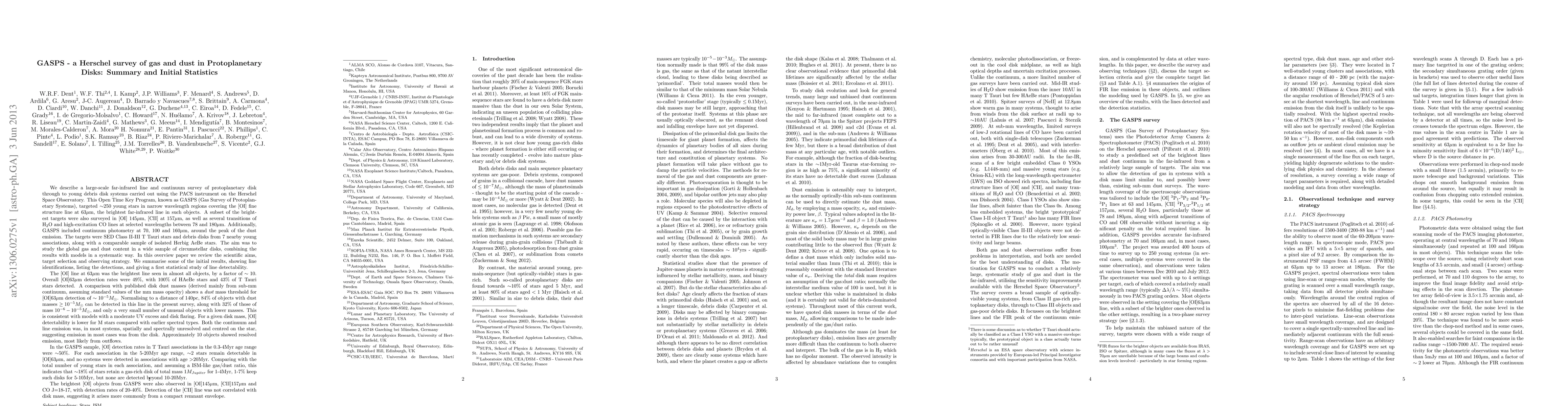 The GASPS Herschel survey investigates gas and dust in protoplanetary disks using far-infrared lines and continuum observations. Initial results show a 49% detection rate for [OI]63um, with 100% of Herbig AeBe stars detected, indicating a dust mass threshold for detection. The survey suggests that gas-rich disks persist for 1-4 Myr in ~18% of stars, declining to none beyond 20 Myr.