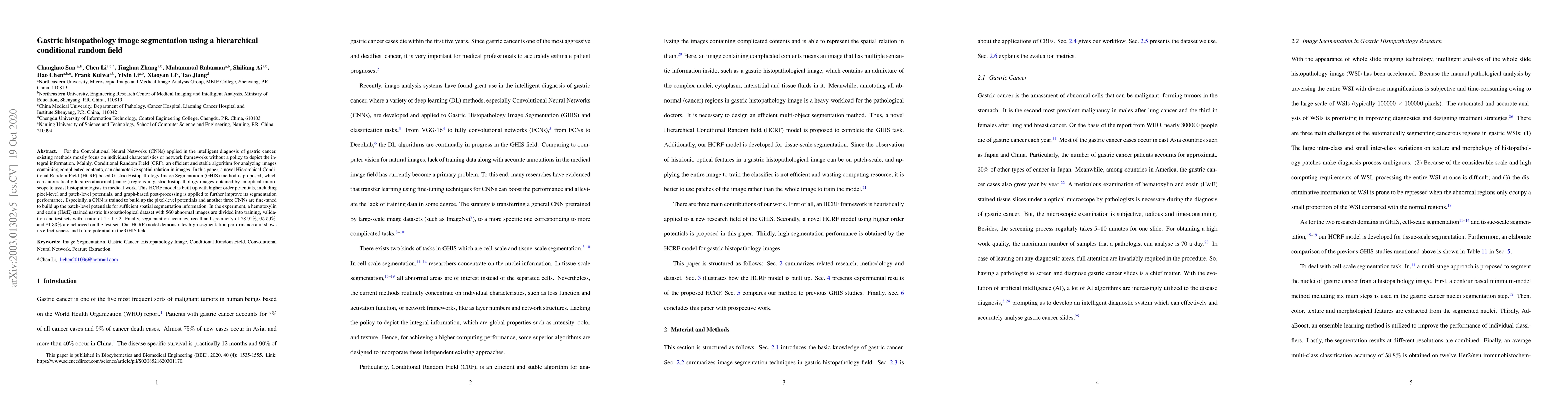 This paper proposes a novel Hierarchical Conditional Random Field (HCRF) method for segmenting abnormal regions in gastric histopathology images, integrating Convolutional Neural Networks (CNNs) to enhance spatial segmentation. The HCRF model achieves high segmentation accuracy, recall, and specificity, demonstrating its effectiveness for assisting histopathologists.