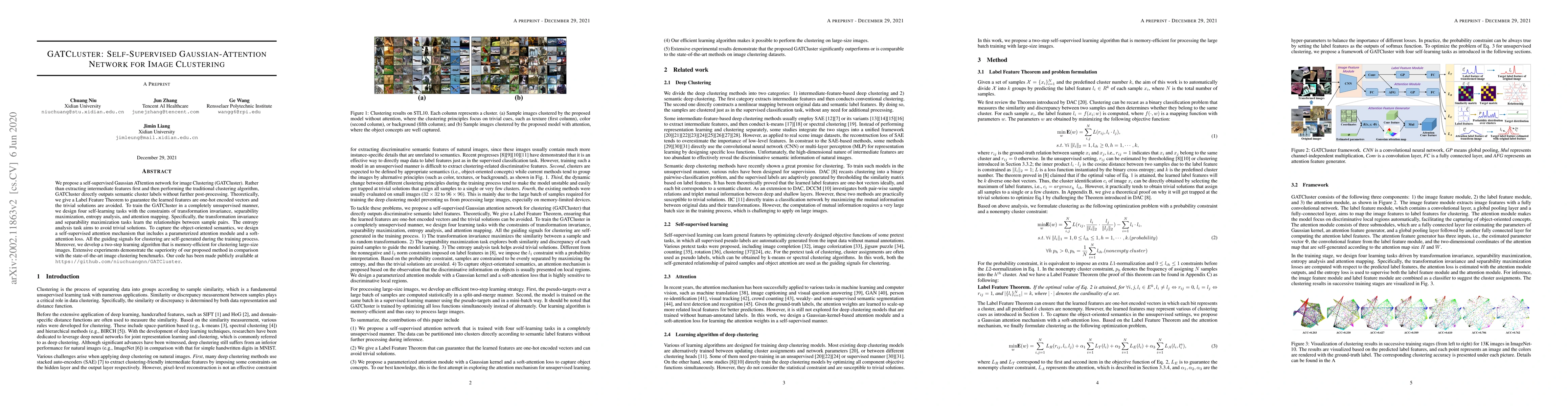 The paper introduces GATCluster, a self-supervised Gaussian-Attention Network for image clustering that directly outputs semantic cluster labels without post-processing. It employs self-learning tasks to train the model in an unsupervised manner, ensuring transformation invariance, separability maximization, and entropy analysis, and includes a self-supervised attention mechanism.
