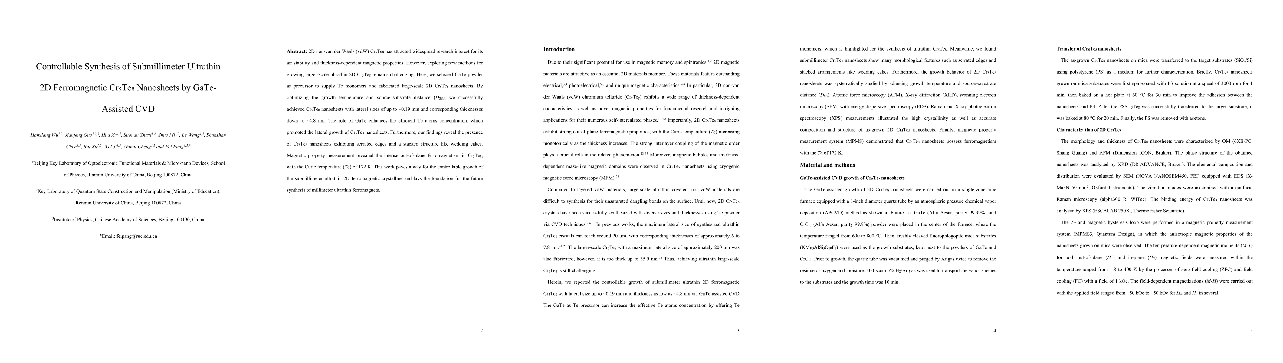 This paper reports the GaTe-assisted CVD growth of ultrathin, large-scale 2D ferromagnetic Cr5Te8 nanosheets with sizes up to ~160 μm and thicknesses as low as 5 nm. The method enables precise control over the lateral size and enhances the material's out-of-plane ferromagnetism, paving the way for applications in spintronics and magnetic memory devices.