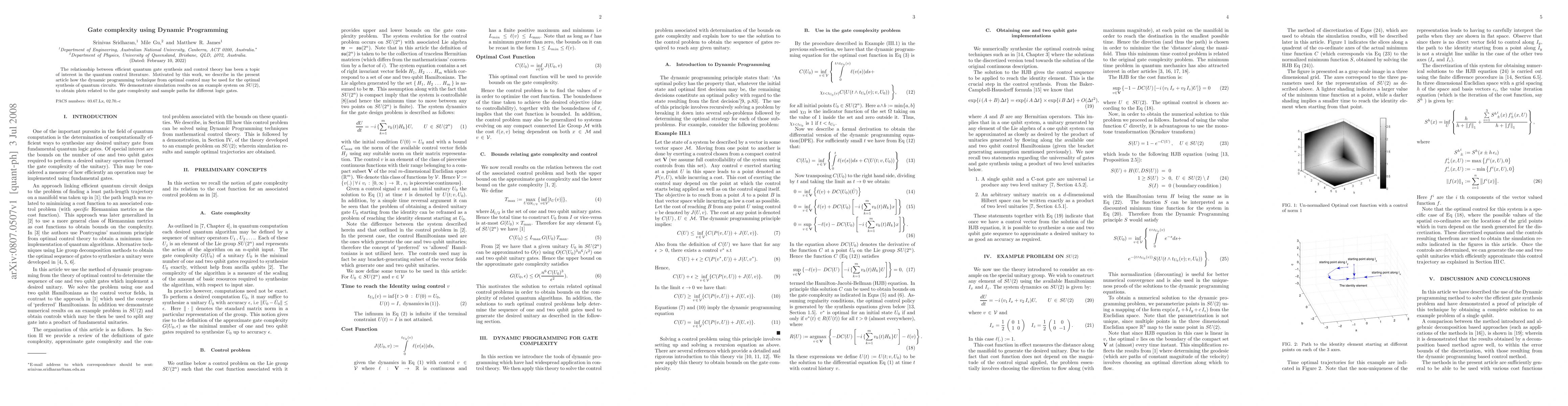 The relationship between efficient quantum gate synthesis and control theory has been a topic of interest in the quantum control literature. Motivated by this work, we describe in the present article how the dynamic programming technique from optimal control may be used for the optimal synthesis of quantum circuits. We demonstrate simulation results on an example system on SU(2), to obtain plots related to the gate complexity and sample paths for different logic gates.