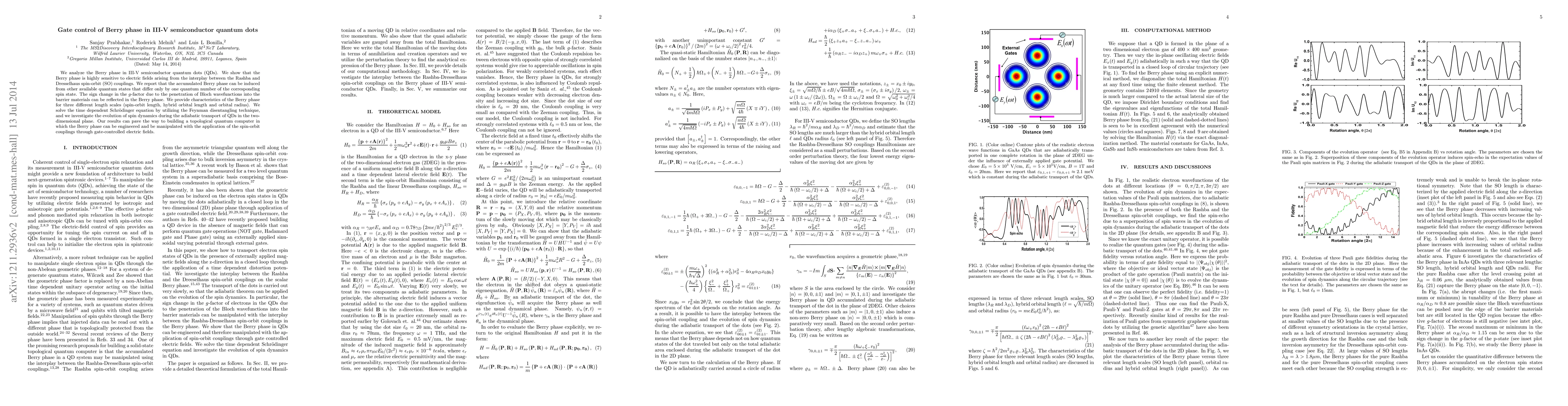 The research investigates the gate control of Berry phase in III-V semiconductor quantum dots (QDs) by solving the time-dependent Schrödinger equation and analyzing spin dynamics during adiabatic movement in a 2D plane. The study considers the interplay between Rashba and Dresselhaus spin-orbit couplings under electric fields.
