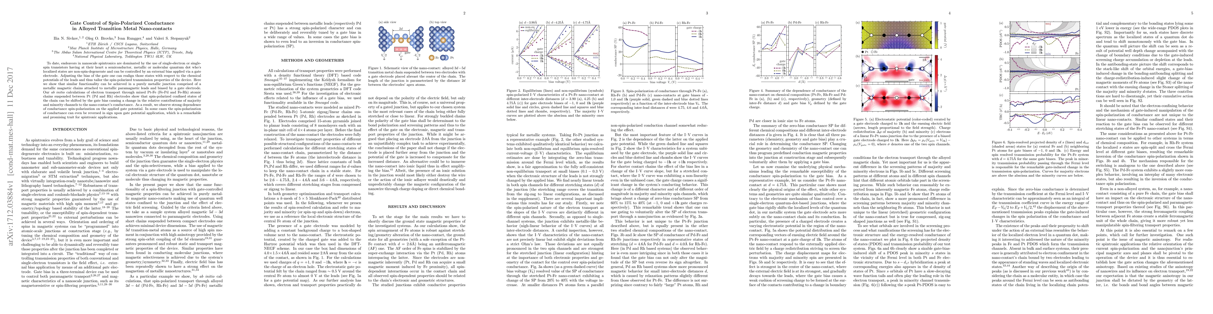 To date, endeavors in nanoscale spintronics are dominated by the use of single-electron or single-spin transistors having at their heart a semiconductor, metallic or molecular quantum dot who's localized states are non-spin-degenerate and can be controlled by an external bias applied via a gate electrode. Adjusting the bias of the gate one can realign those states with respect to the chemical potentials of the leads and thus tailor the spin-polarized transmission properties of the device. Here we show that similar functionality can be achieved in a purely metallic junction comprised of a metallic magnetic chains attached to metallic paramagnetic leads and biased by a gate electrode. Our ab initio calculations of electron transport through mixed Pt-Fe (Fe-Pd and Fe-Rh) atomic chains suspended between Pt (Pd and Rh) electrodes show that spin-polarized confined states of the chain can be shifted by the gate bias causing a change in the relative contributions of majority and minority channels to the nano-contact's conductance. As a result, we observe strong dependence of conductance spin-polarization on the applied gate potential. In some cases the spin-polarization of conductance can even be reversed in sign upon gate potential application, which is a remarkable and promising trait for spintronic applications.