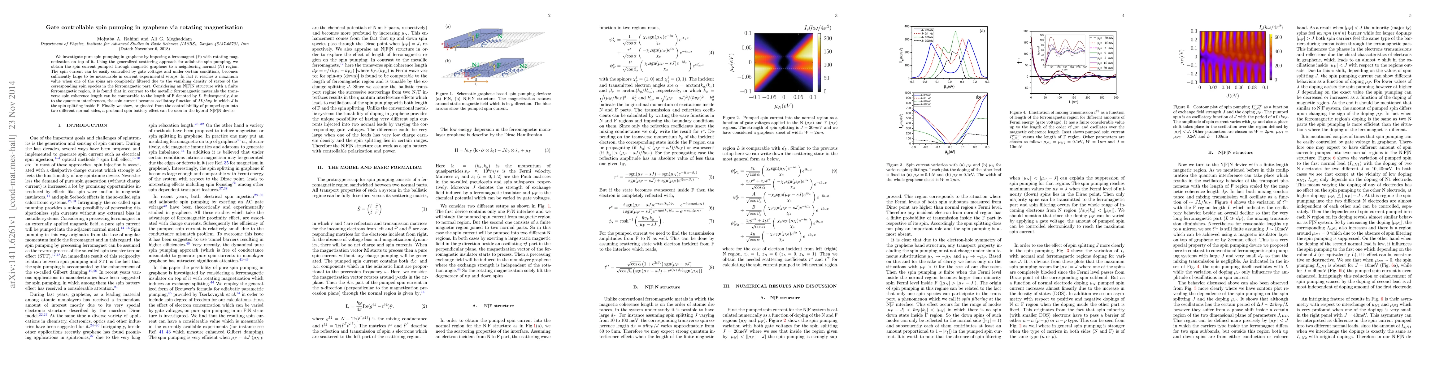 We investigate pure spin pumping in graphene by imposing a ferromagnet (F) with rotating magnetization on top of it. Using the generalized scattering approach for adiabatic spin pumping, we obtain the spin current pumped through magnetic graphene to a neighboring normal (N) region. The spin current can be easily controlled by gate voltages and under certain conditions, becomes sufficiently large to be measurable in current experimental setups. In fact it reaches a maximum value when one of the spins are completely filtered due to the vanishing density of states of the corresponding spin species in the ferromagnetic part. Considering an N|F|N structure with a finite ferromagnetic region, it is found that in contrast to the metallic ferromagnetic materials the transverse spin coherence length can be comparable to the length of F denoted by $L$. Subsequently, due to the quantum interferences, the spin current becomes oscillatory function of $JL/\hbar v_F$ in which $J$ is the spin splitting inside F. Finally we show, originated from the controllability of pumped spin into two different normal sides, a profound spin battery effect can be seen in the hybrid N|F|N device.