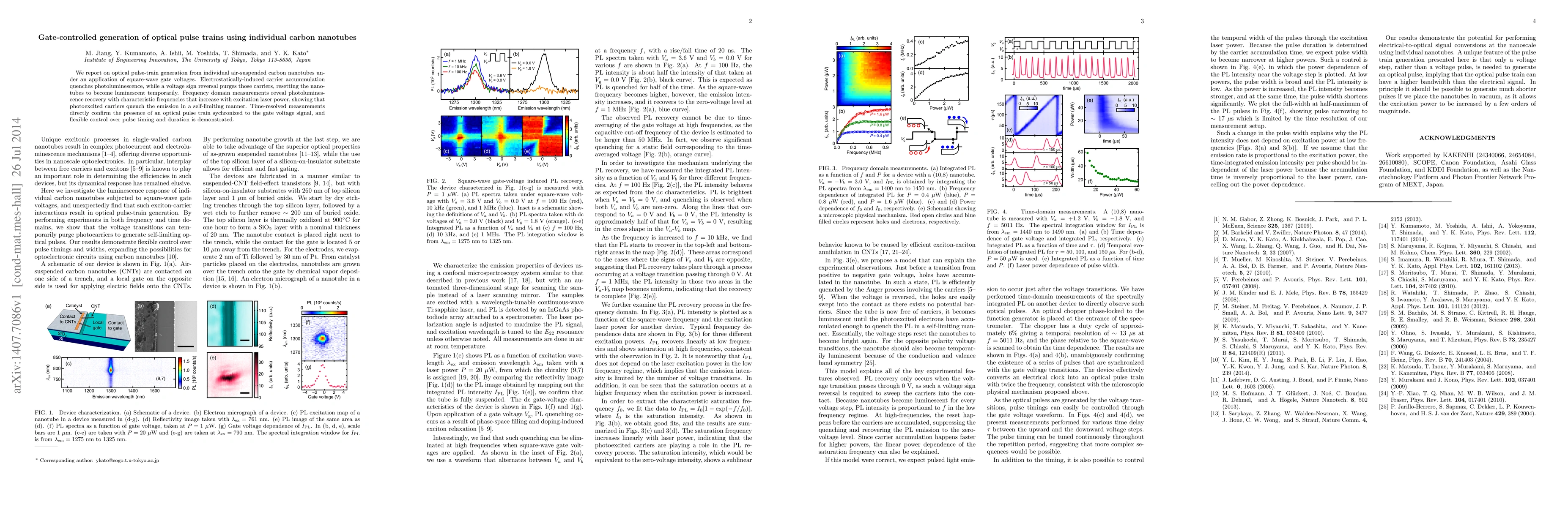 This paper demonstrates optical pulse-train generation from individual carbon nanotubes controlled by gate voltages. Electrostatic carrier accumulation quenches photoluminescence, which resets upon voltage reversal, creating synchronized optical pulses.