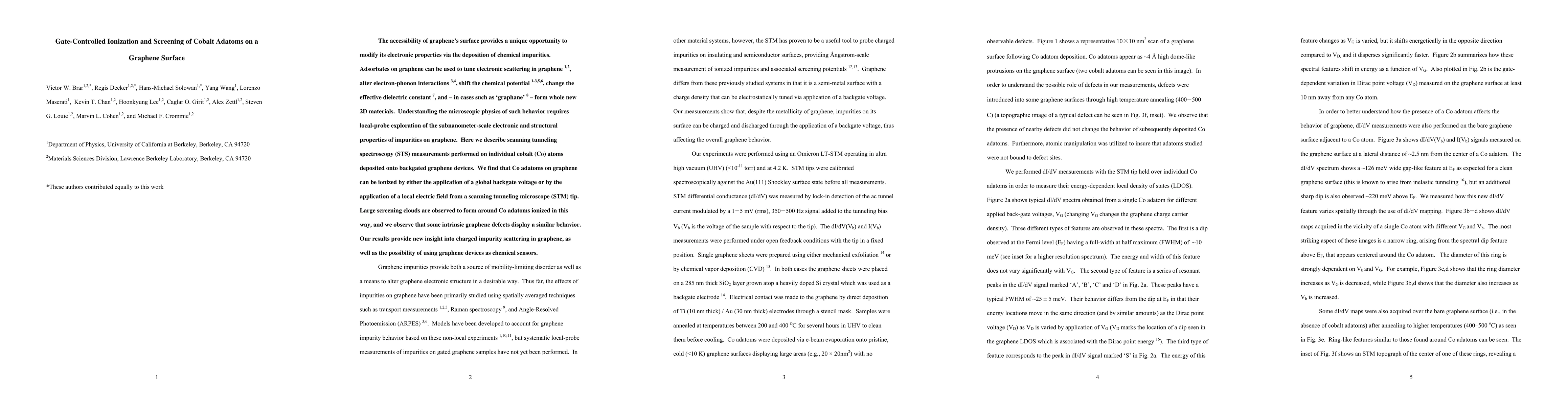 This study uses scanning tunneling spectroscopy to investigate cobalt adatoms on graphene, revealing that they can be ionized via global or local electric fields, leading to significant screening effects. These findings enhance understanding of charged impurity scattering in graphene and suggest potential applications in chemical sensing.