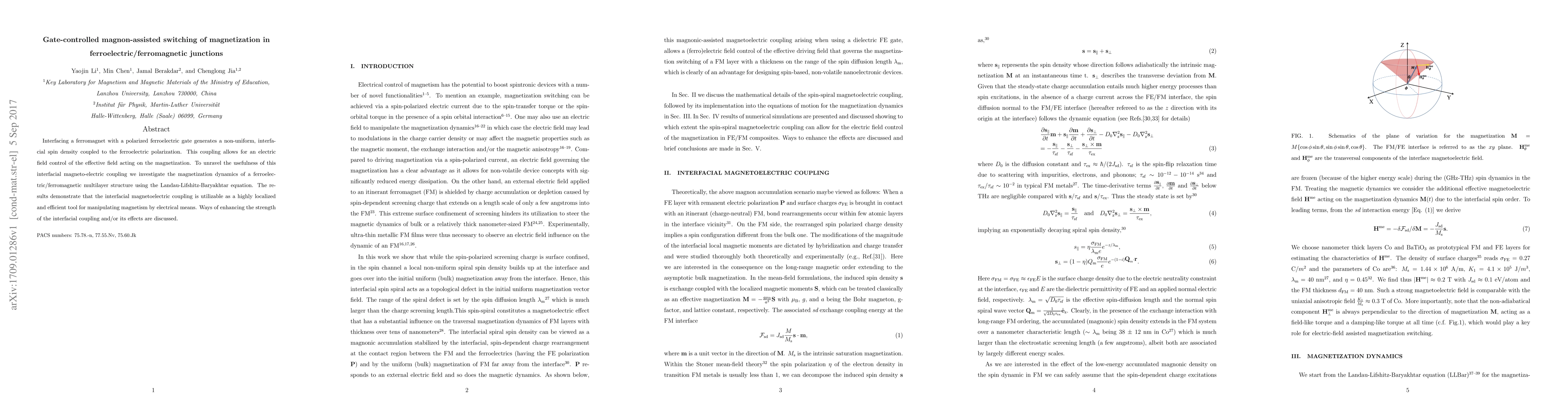 This paper investigates the gate-controlled switching of magnetization in ferroelectric/ferromagnetic junctions, demonstrating that interfacial magnetoelectric coupling can efficiently manipulate magnetization through electric field control, utilizing the Landau-Lifshitz-Baryakhtar equation for dynamic analysis.
