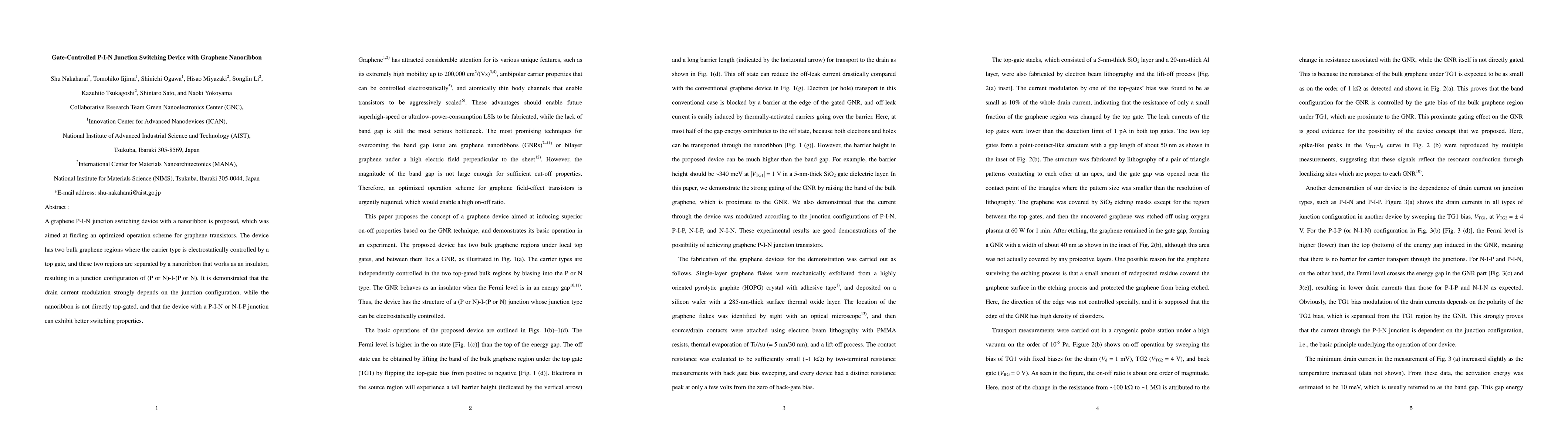 A novel graphene P-I-N junction switching device with a graphene nanoribbon has been demonstrated, optimizing transistor performance with superior on-off properties. The device employs a top gate to control carrier type in bulk graphene regions separated by an insulating nanoribbon, achieving reduced leakage current through a high barrier height and long tunneling length.