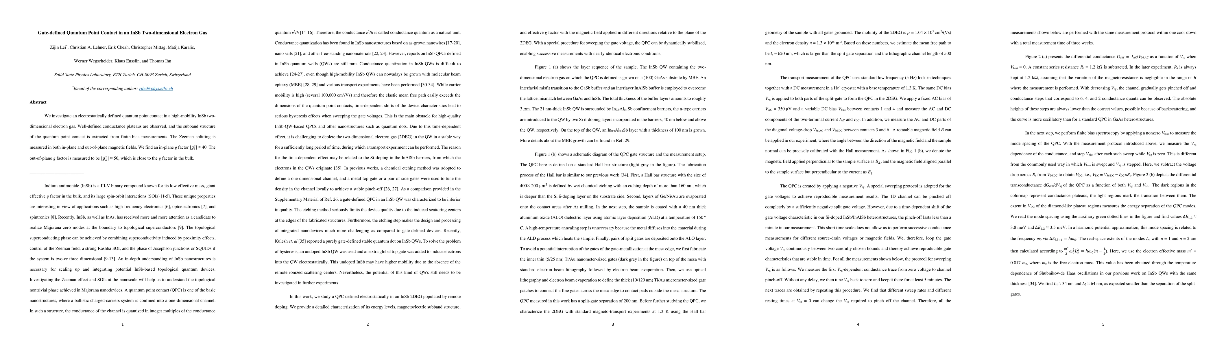 This paper studies a quantum point contact in an InSb two-dimensional electron gas, observing well-defined conductance plateaus and extracting the subband structure. The in-plane and out-of-plane Zeeman splittings reveal g factors of approximately 40 and 50, respectively, close to the bulk g factor.