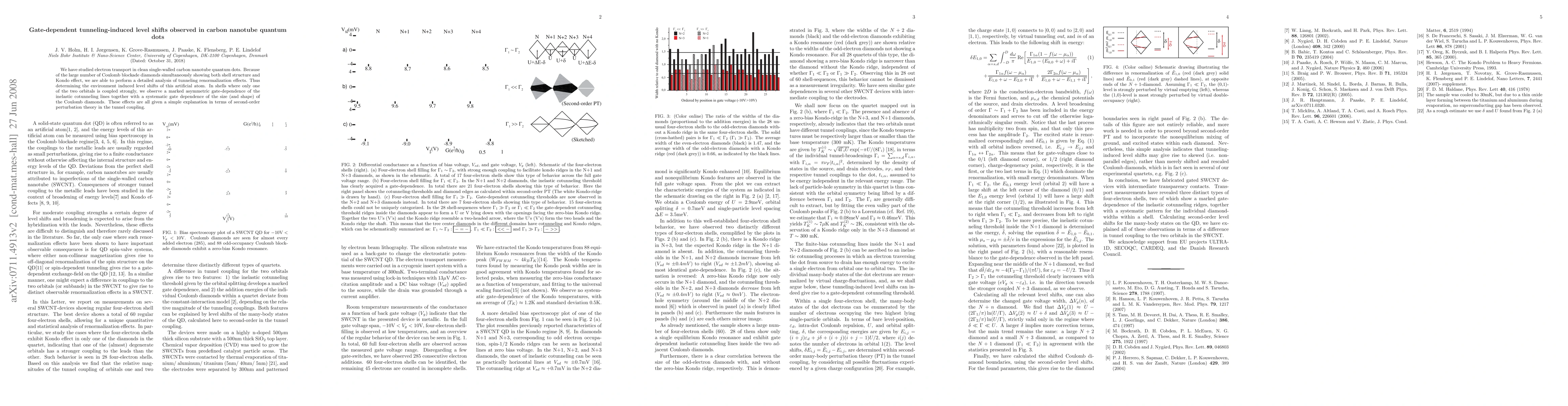 This study investigates electron transport in carbon nanotube quantum dots, revealing gate-dependent tunneling-induced level shifts due to strong coupling in specific orbitals. The observed asymmetric gate-dependence of inelastic cotunneling lines and variations in Coulomb diamonds are explained via second-order perturbation theory in tunnel coupling.